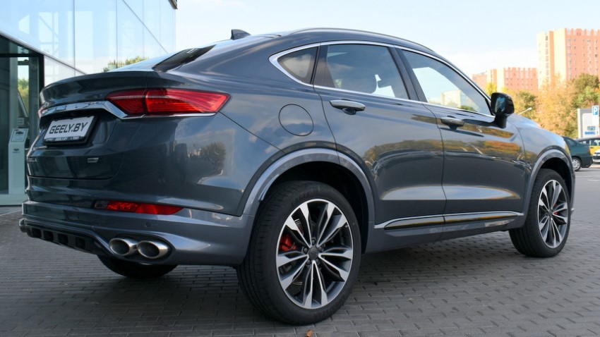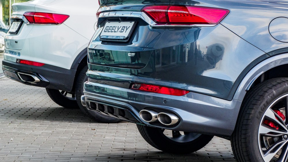 На «корме» появился бампер с уменьшенным диффузором, по краям которого теперь расположилась пара сдвоенных выхлопных патрубков овального сечения. Вообще, внешне рестайлинговый кроссовер повторяет топовую в Китае комплектацию Geely Tugella Phantom Edition.