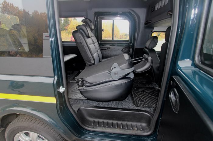 В салоне новинки установлено 3 ряда сидений с 9-ю посадочными местами — место переднего пассажирского кресла занял 2-местный диван, а в модуле, кстати, не отделённым от кабины перегородкой — ещё пара 3-местных. В перспективе возможно появление версий, число мест в которых будет варьироваться от 5 до 8.