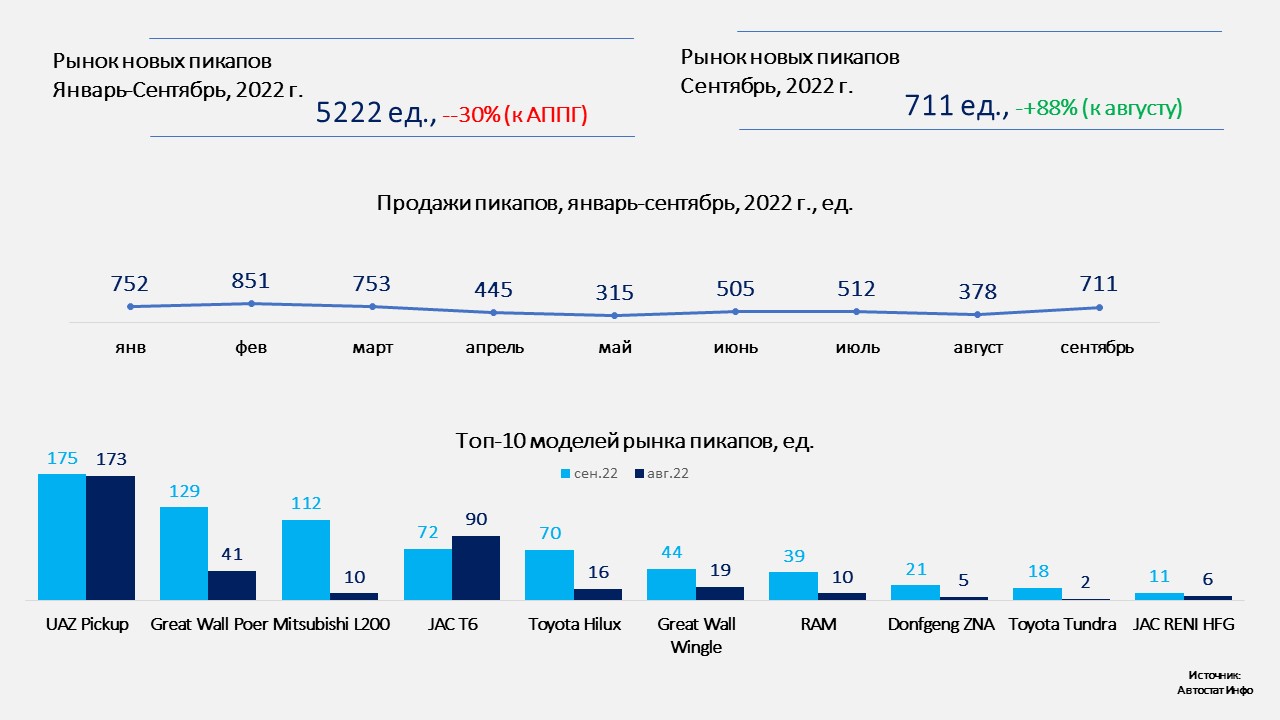 В то же время этот показатель на 34,5% меньше, чем в первом месяце прошлой осени. Всего же за 3 квартала текущего года в России было продано 5 222 новых пикапа, что на 30% меньше, чем за январь-сентябрь 2021 г.