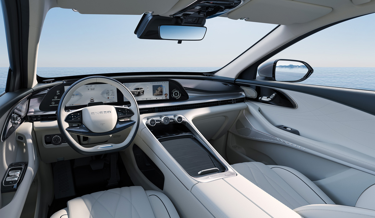 Интерьер паркетника также отличается от актуальных автомобилей Exeed. Главное новшество — замена обычного селектора КПП на «кочергу» в американском стиле, установленную с правой стороны рулевой колонки.