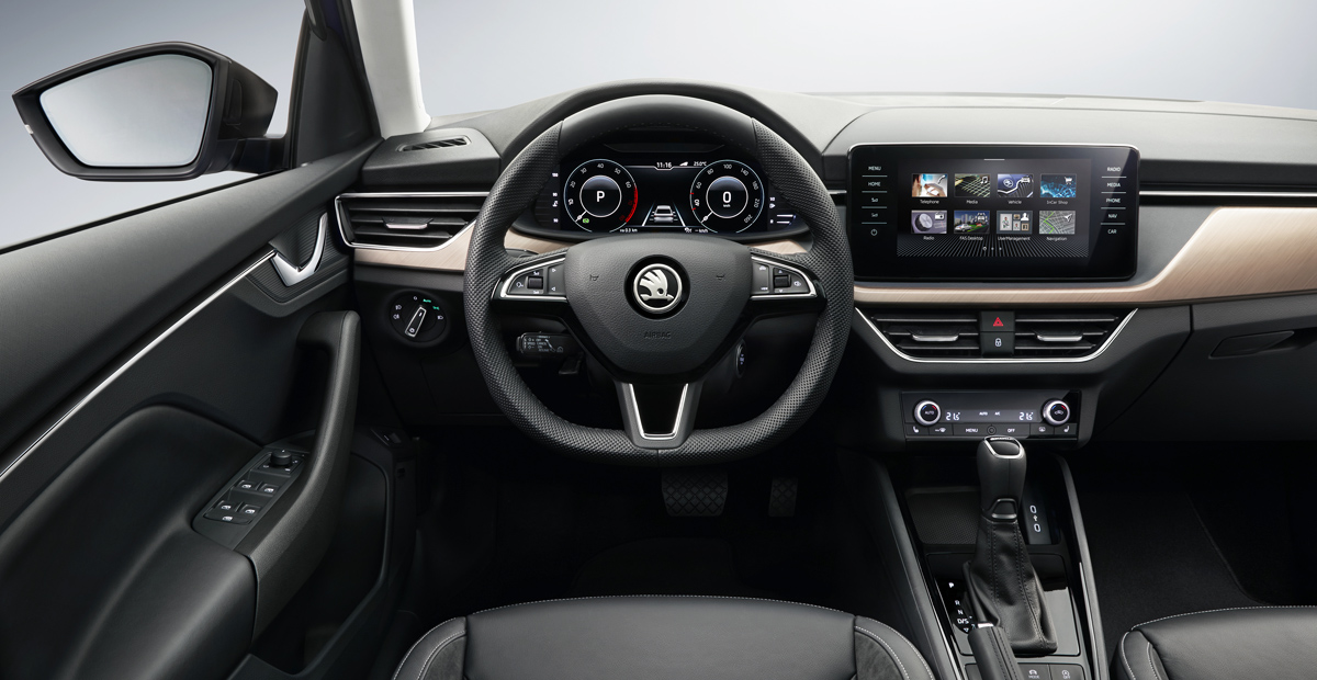 В перечне штатного оснащения Skoda Scala значатся: полностью светодиодная оптика с динамическими задними «поворотниками», адаптивный круиз-контроль, «всефольксвагеновская» цифровая панель приборов Virtual Cockpit диагональю в 10,25 дюйма, 2-зонный климат-контроль, электропривод 5-й двери и обогрев руля.