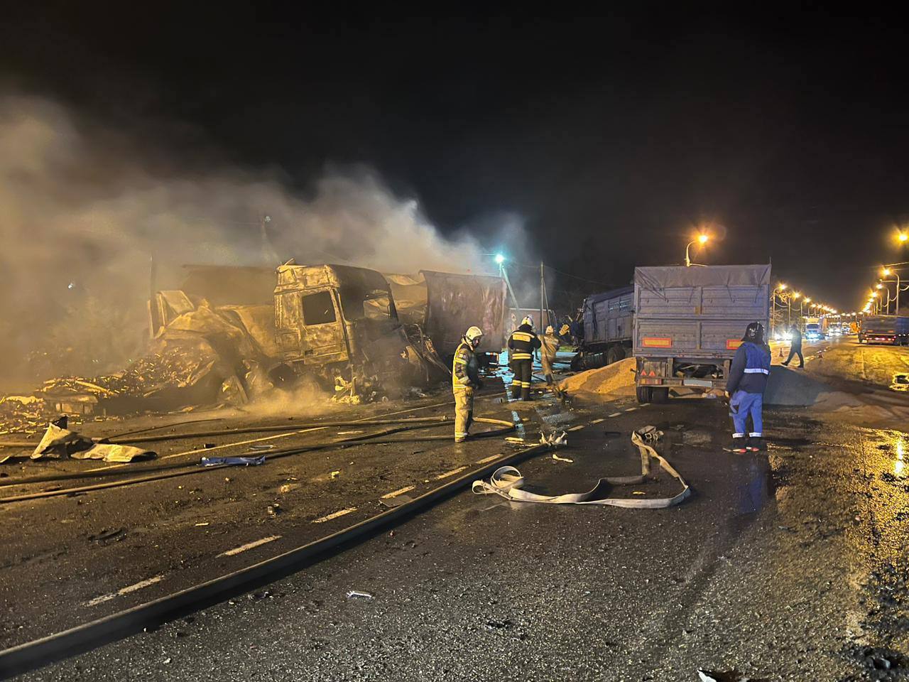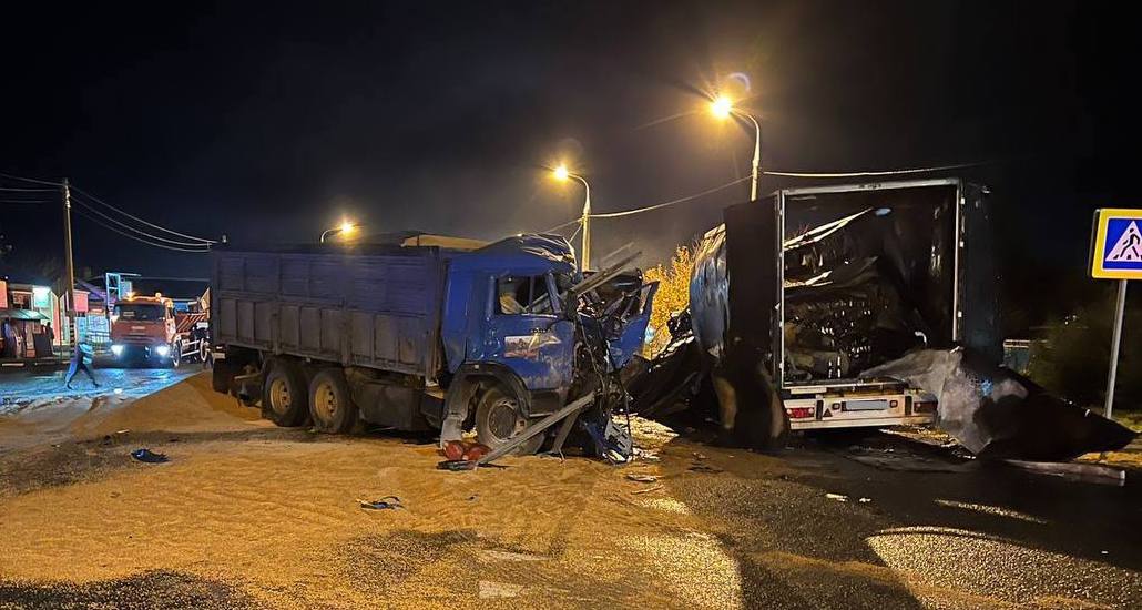 По предварительным данным, КамАЗ-зерновоз ехал со стороны Усть-Лабинска в сторону Краснодара, в результате заноса выехал на встречную полосу и там столкнулся с грузовиком «Мерседес» с прицепом, который вез алкогольную продукцию. «Мерседес» загорелся.