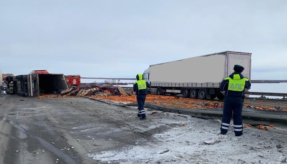 Большегруз, как выяснилось, перевозил фрукты — в частности, мандарины — из Краснодарского края. Новогодние цитрусовые предназначались жителям Сибири, сообщили в полиции. На фото с места происшествия видно, что мандарины из опрокинувшейся фуры высыпались на проезжую часть.