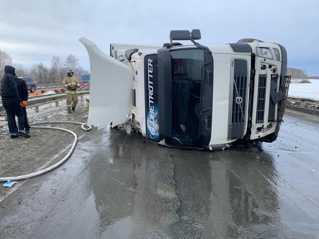 По предварительной информации, 28-летний водитель грузового автомобиля «Вольво» по каким-то причинам не смог выдержать безопасную дистанцию и врезался в КамАЗ, который останавливался на полосе из-за неисправности. В результате «Вольво» опрокинулся на проезжей части.
