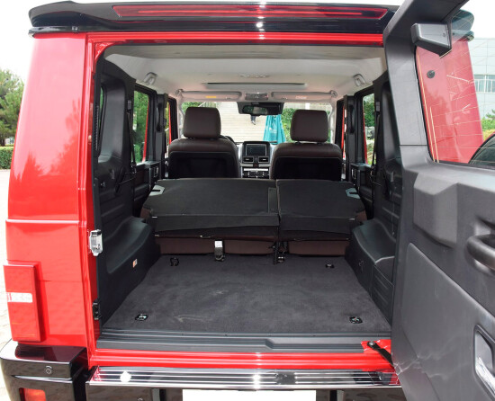 Габариты Beijing BJ80: длина — 4 765 мм, ширина — 1 955 мм, высота — 2005 мм, база — 2 800 мм. Клиренс — 215 мм, что нормально для современных внедорожников. А вот объём багажника откровенно маловат для автомобиля таких размеров — всего 500 л. до полки.