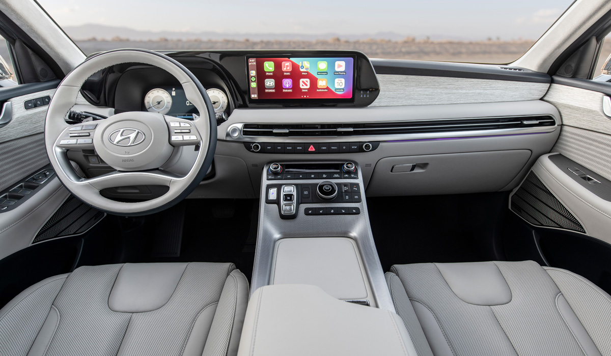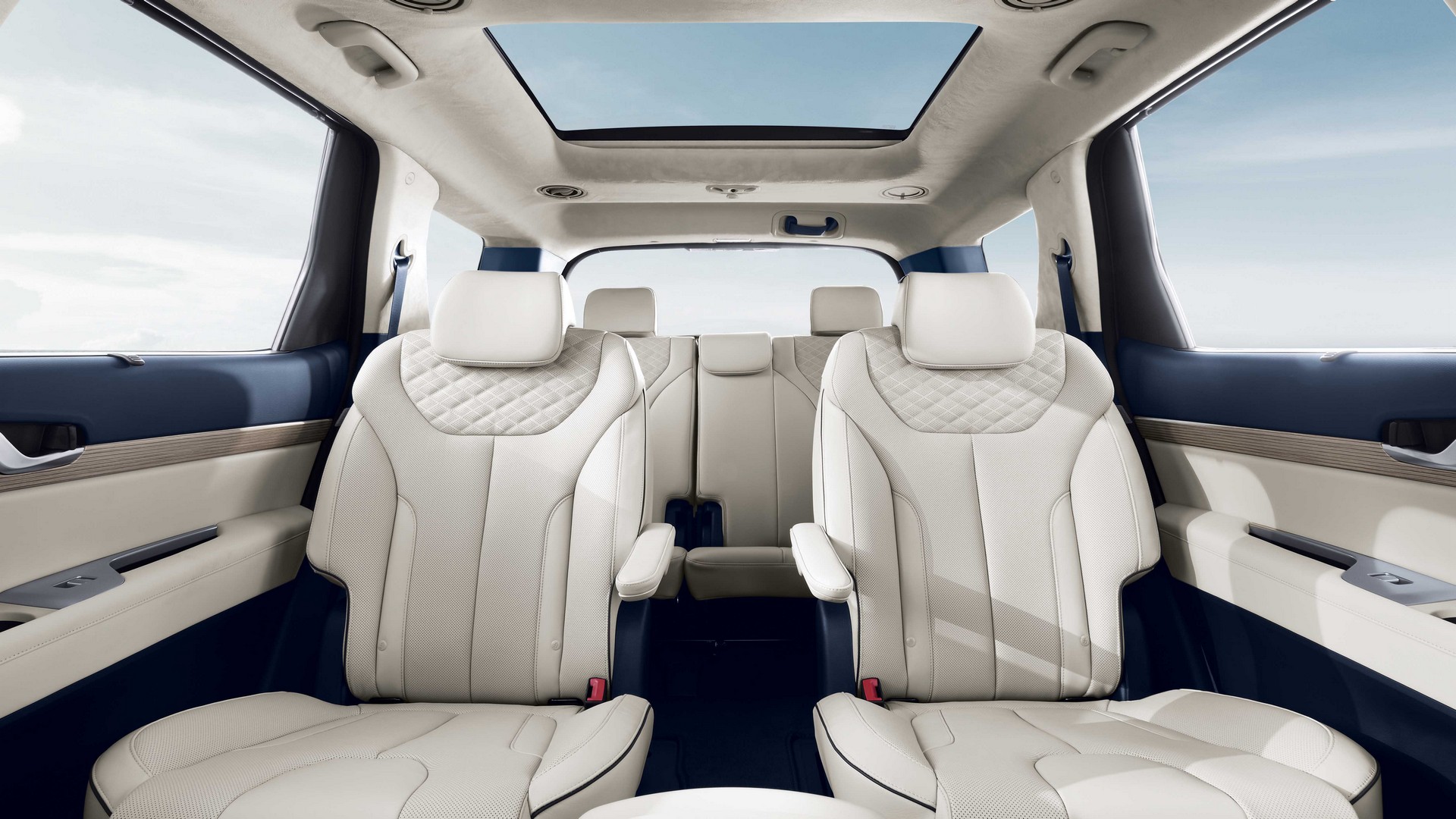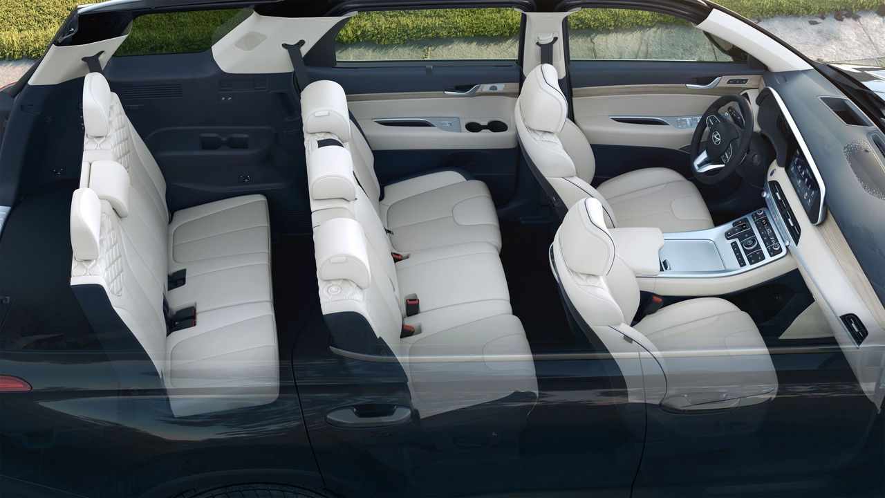 Габариты обновлённого кроссовера не изменились: длина — 4 995 мм, ширина — 1 975 мм, высота — 1 750 мм, база — 2 900 мм. Клиренсом автомобиль больше напоминает хороший внедорожник — 203 мм. Багажник у Hyundai Palisade вместительный: 510 л. до полки и 2 000 л. — при сложенных сиденьях 2-го и 3-го ряда.