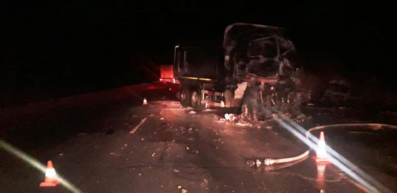 Два большегруза столкнулись и загорелись на трассе в Омской области, один из водителей погиб