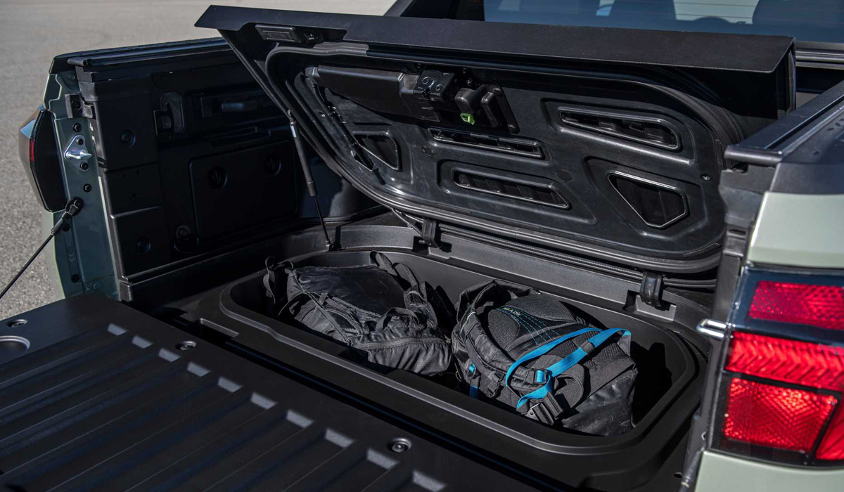Пикап также оборудован адаптивным круиз-контролем, системой кругового видеообзора, передними креслами с электрорегулировками и вентиляцией, панорамным люком, системой автоматического экстренного торможения, пластиковым «сундуком» для мелкого скарба под задним сиденьем и много чем ещё.
