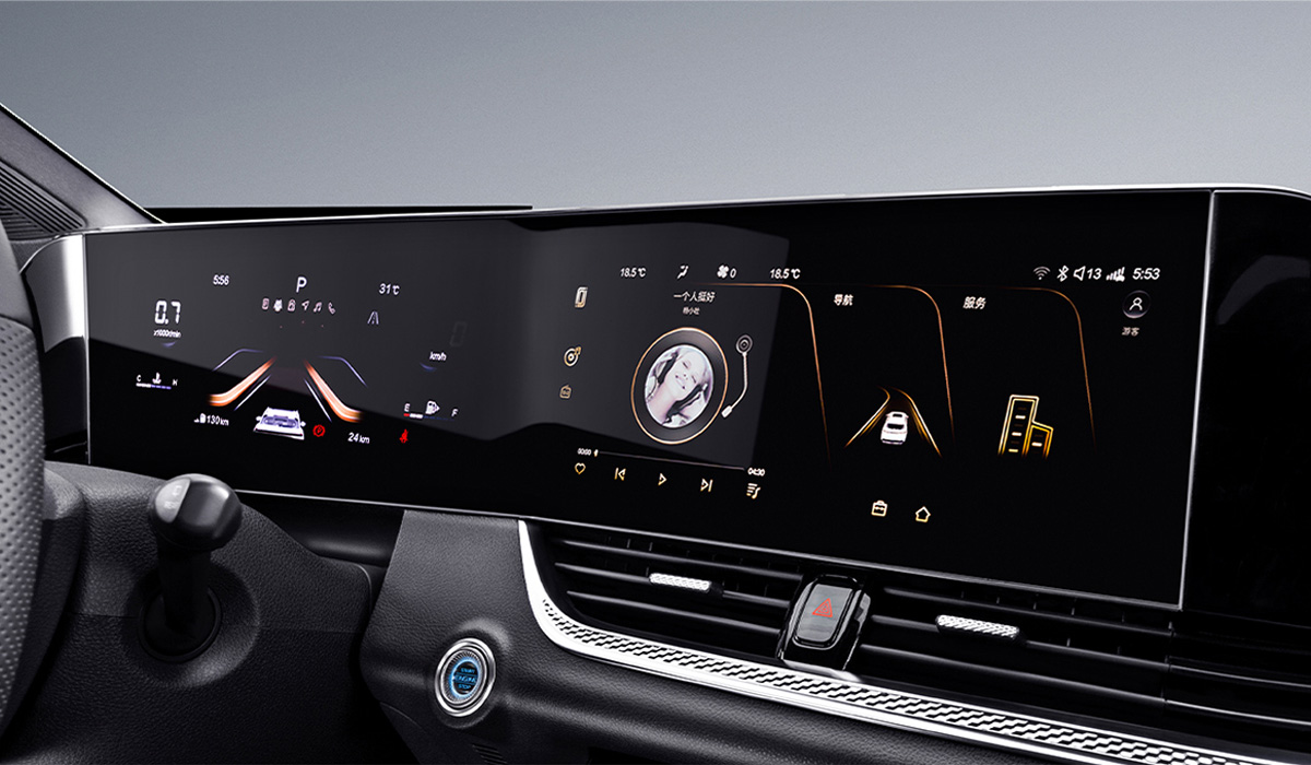 По оформлению интерьера и штатному оснащению паркетник практически полностью идентичен лифтбеку: цифровая «приборка», визуально объединённая со слегка повёрнутым к водителю тачскрином мультимедийной системы, имеющим диагональ в 12,3 дюйма, а также 2-зонный климат-контроль с частично сенсорным (есть 2 вращающиеся «шайбы») пультом управления.