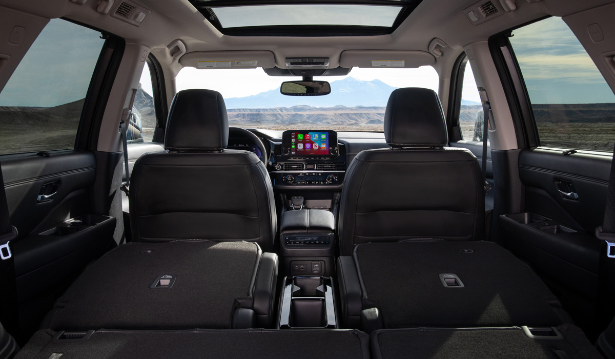 Габариты Nissan Pathfinder: длина — 5 004 мм, ширина — 1 978 мм, высота — 1 810 мм, база — 2 900 мм. Клиренс — вполне достойные для большого паркетника 194 мм. Минимальный объём багажника не так уж велик — 470 л., но, если сложить 2-й и 3-й ряды сидений, он возрастает до 2 280 л.