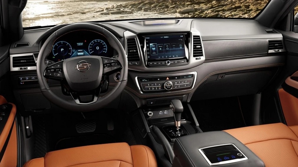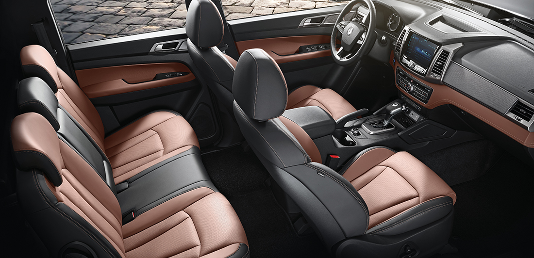 В список штатного оснащения SsangYong Rexton Sports входят: цифровая «приборка», 2-зонный климат-контроль, мультимедийная система, обогрев всех сидений, система кругового видеообзора, передние кресла с вентиляцией и электрорегулировками, система автоматического экстренного торможения, кожаный салон и много чего другого.