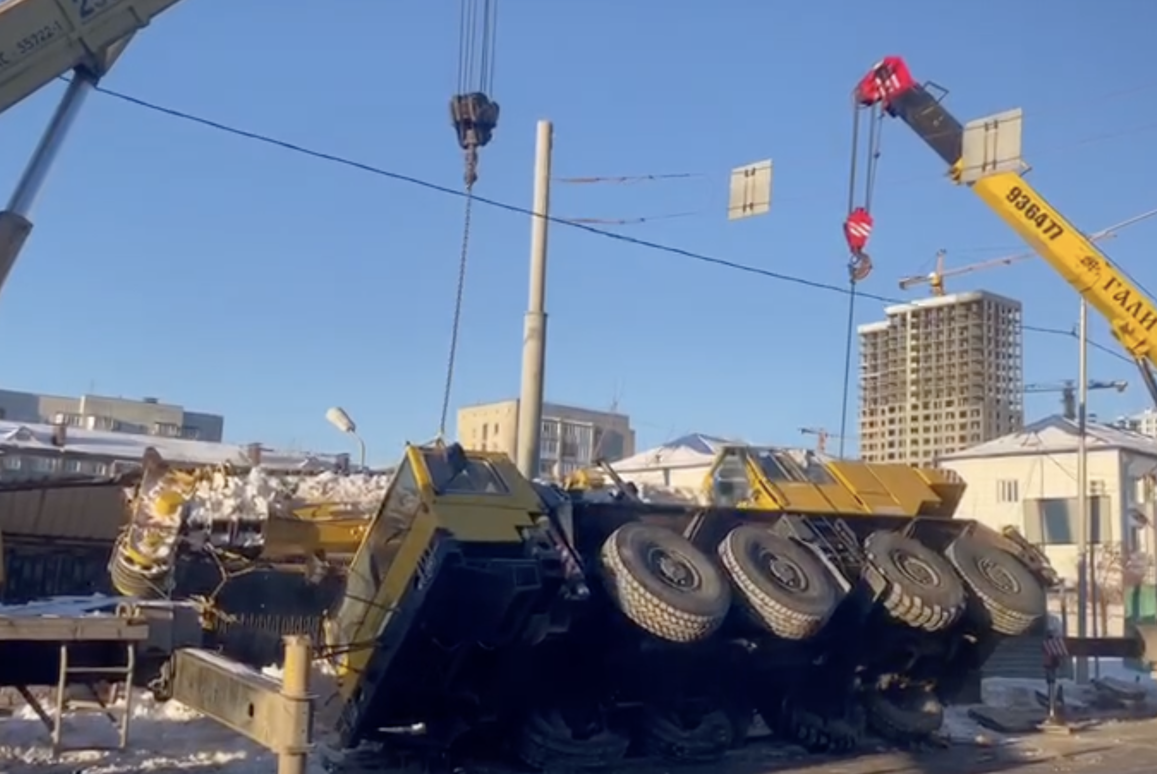 Для поднятия и погрузки упавшего крана была задействована дополнительная техника.