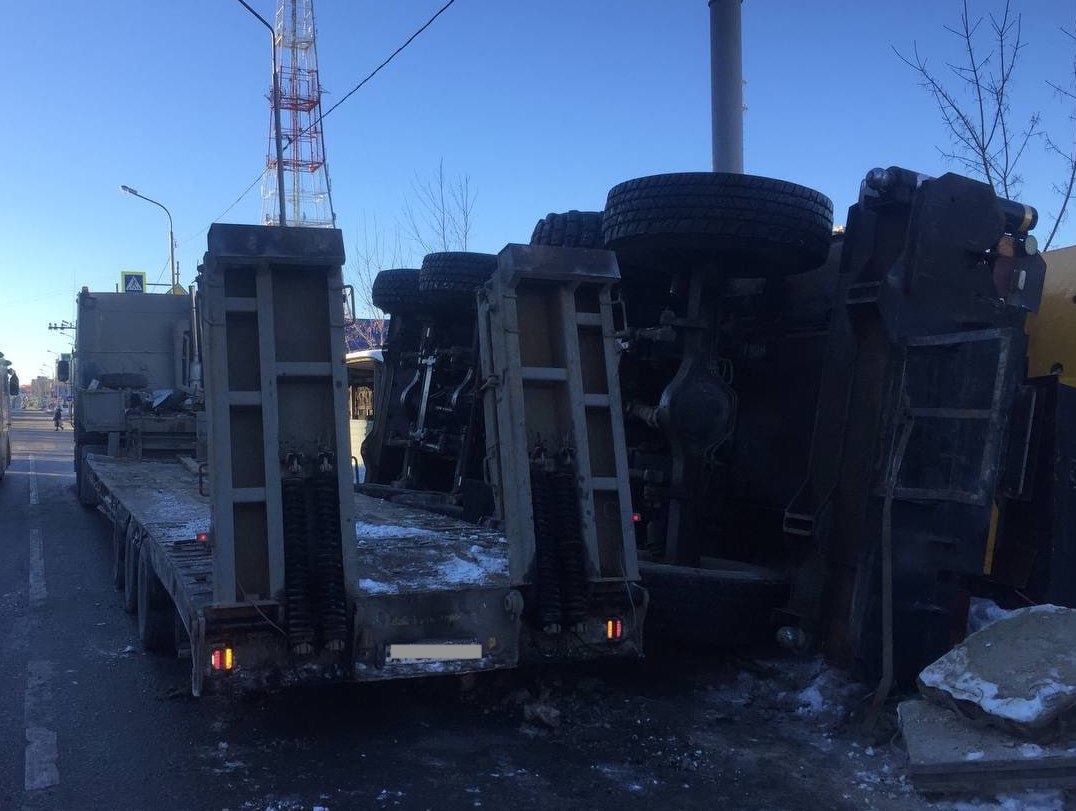 Опрокинувшийся автокран ограничил движение по улице Пермякова в Тюмени