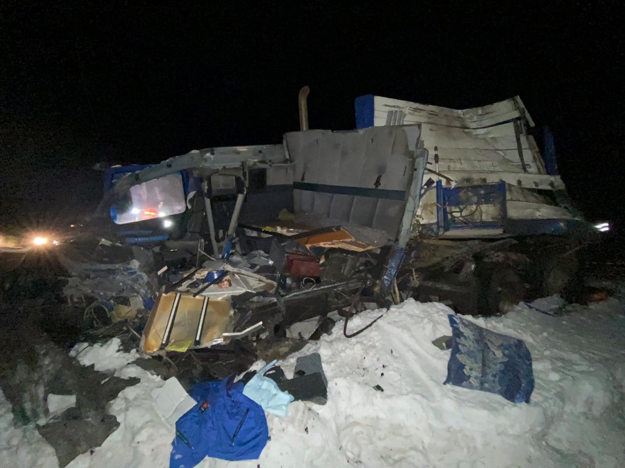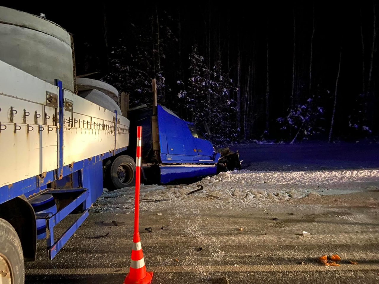 Столкновение большегрузов произошло накануне, 17 января, в восьмом часу вечера, на 498 км трассы Тюмень — Ханты-Мансийск, сообщает ГИБДД Тюменской области.