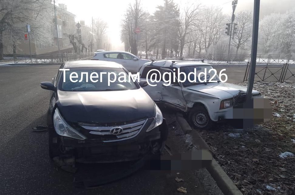 Первое ДТП произошло сегодня, 18 января, около 8 часов утра, на перекрестке улиц Пушкина и Буачидзе, сообщает Госавтоинспекция Ставрополья. По предварительным данным, 35-летний водитель автомобиля ВАЗ-2107 при повороте направо не предоставил преимущество в движении и столкнулся в итоге с «Хёндэ Соната». Затем «семерка» по инерции врезалась в светофорную опору.
