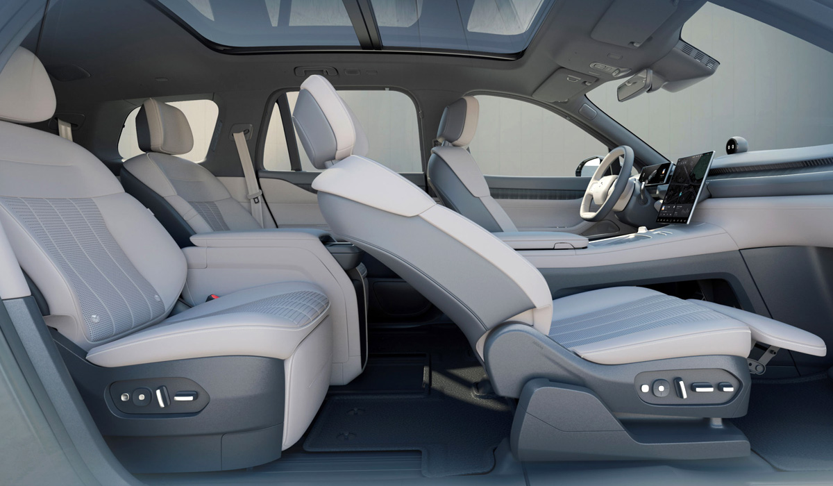 В салоне новинки установлено 3 ряда сидений с 6-ю посадочными местами. Раздельные кресла переднего и среднего рядов оборудованы электрорегулировкой, обогревом, вентиляцией и массажёрами. «Галёрка» намного проще – для неё предусмотрен только электропривод складывания спинок.