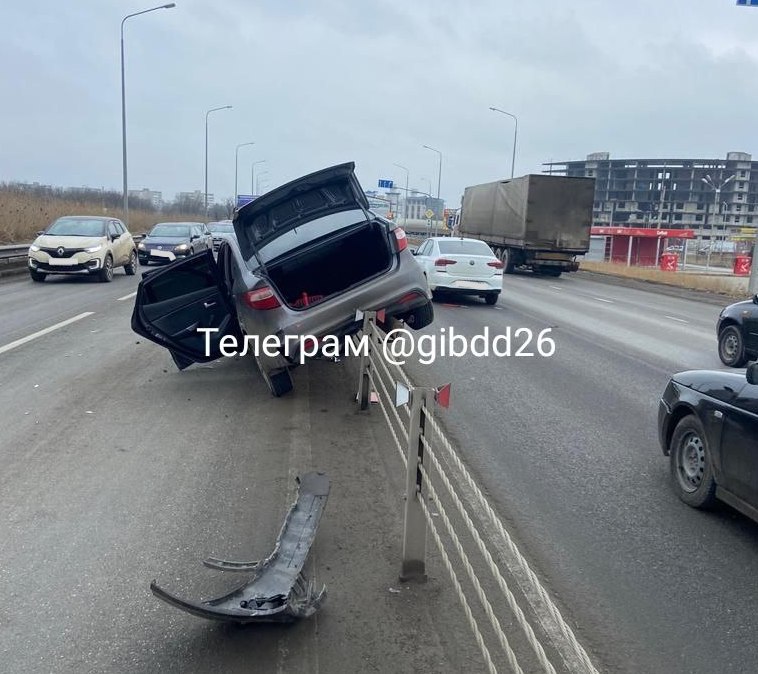 В Минеральных Водах легковушка после столкновения с тягачом повисла на ограждении