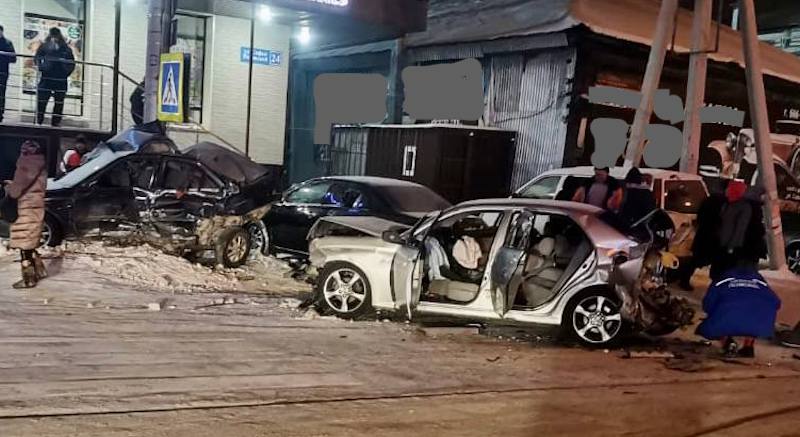 По предварительным данным, здесь столкнулись «Тойота Веросса» и «Субару Форестер». После этого машины отбросило на припаркованные автомобили «Ниссан Санни» и «Тойота Королла».