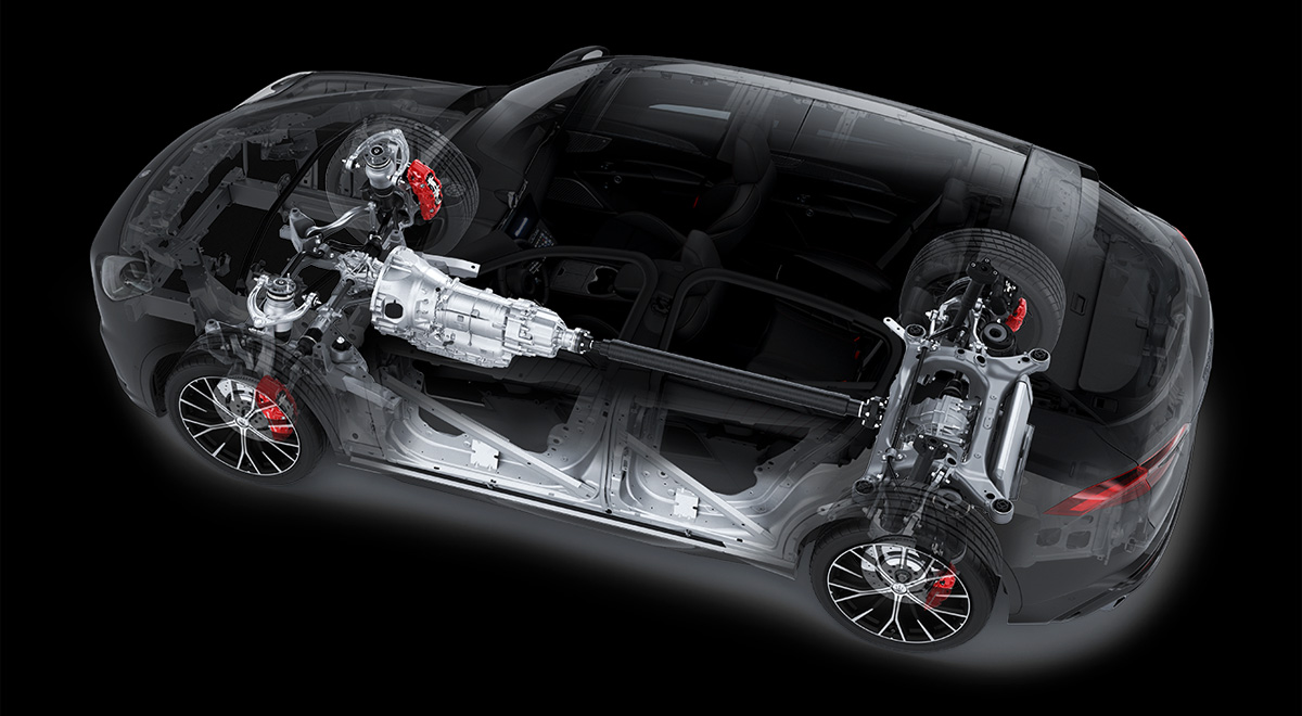 Этот двигатель, оборудованный двойным турбонаддувом с электроприводом и 48-вольтовым стартер-генератором, работает в паре с 8-ступенчатым «автоматом» немецкой фирмы ZF, управляемым подрулевыми переключателями-«лепестками». Привод — полный, с многодисковой муфтой подключения передней оси. Интересно, что карданные валы кроссовера сделаны из карбона.