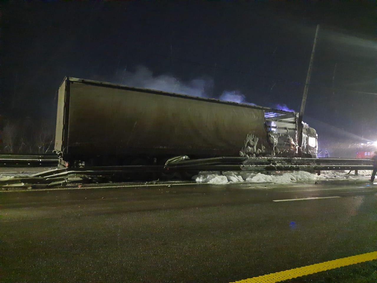 После столкновения оба грузовика врезались в межполосное барьерное ограждение и загорелись.