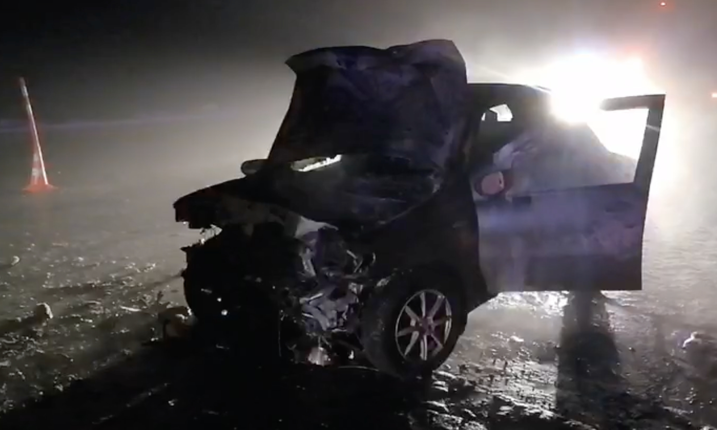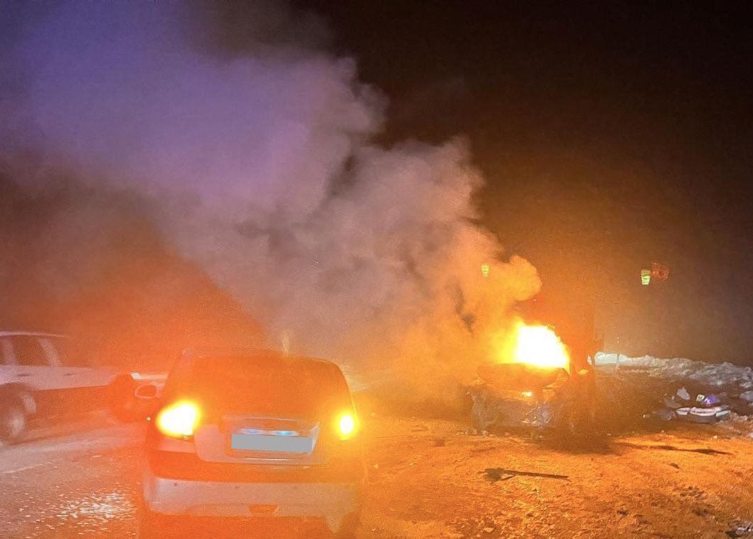 По информации дорожной полиции, здесь столкнулись «Фиат и «Хёндэ». По предварительным данным, «Фиат» по каким-то причинам выехал на встречную полосу. После удара он загорелся.