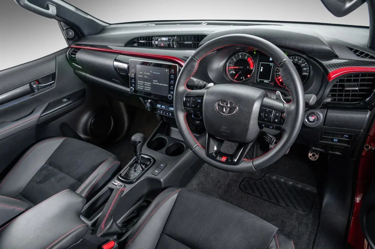 В штатное оснащение Toyota Hilux входят: аналоговая «приборка» с полихромным дисплеем бортового компьютера, имеющим диагональ в 4,2 дюйма, электрорегулировка передних кресел и наружных зеркал, мультимедийная система с тачскрином диагональю в 8 дюймов, поддерживающая сервисы Apple CarPlay и Android Auto, фирменный набор электронных средств безопасности Toyota Safety Sense, аудиосистема JBL и некоторые другие опции.