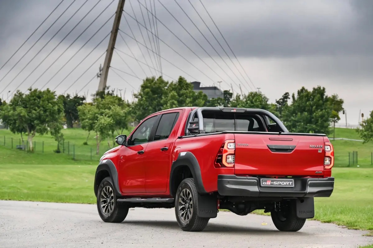 Toyota Hilux GR Sport отличается от простых версий пикапа передним бампером и решёткой радиатора, увеличенными расширителями колёсных арок, 17-дюймовыми колёсами с широкими «зубастыми» шинами и мощными буксировочными проушинами под задним бампером.