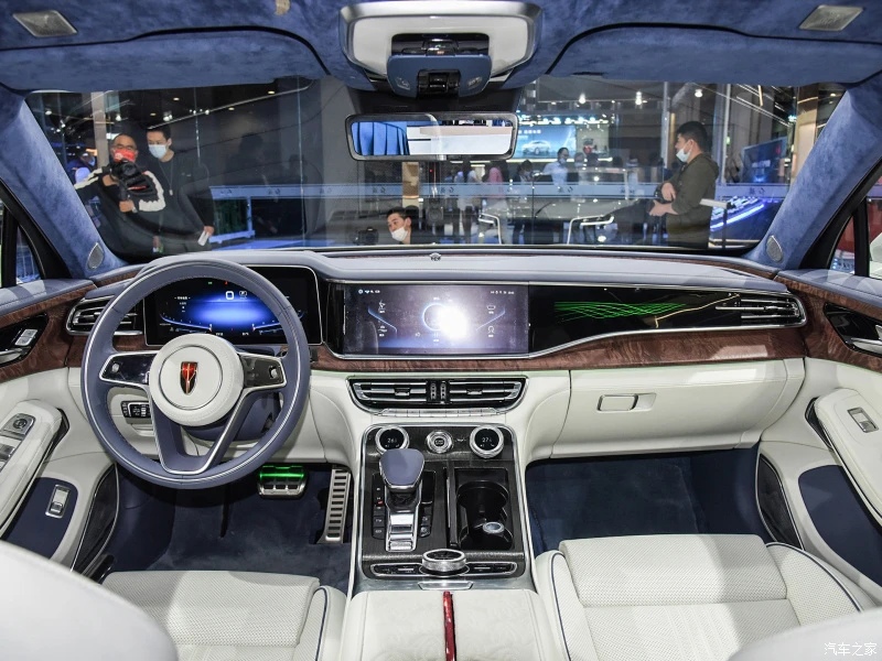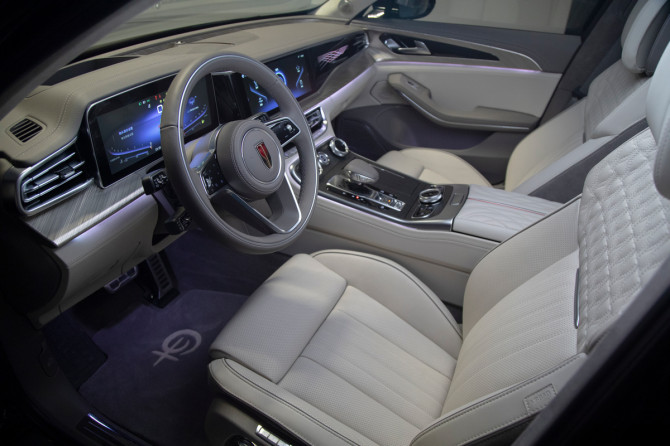 Перечень штатного оснащения Hongqi H9+ очень богат — он полностью соответствует люкс-классу. Например, автомобиль получил адаптивную пневмоподвеску, антибактериальный салонный фильтр с ионизатором воздуха, 4-зонный климат-контроль, а также вытянутый по горизонтали дисплей, занимающий практически всю переднюю панель салона.