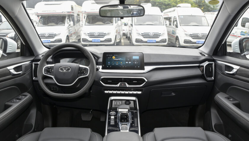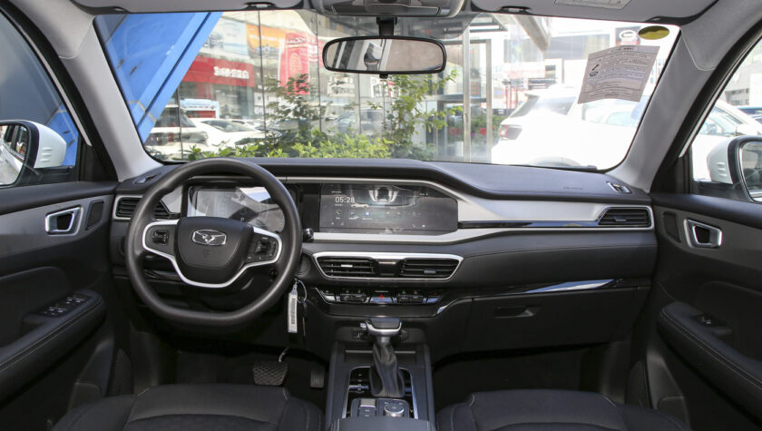 Дальше начинаются различия. Например, оба кроссовера имеют виртуальные «приборки», но у Kaiyi X3 она объединена с тачскрином мультимедийной системы под общим солнцезащитным козырьком, а у Kaiyi X3 Pro тачскрин одиноко «парит» над центральной консолью.