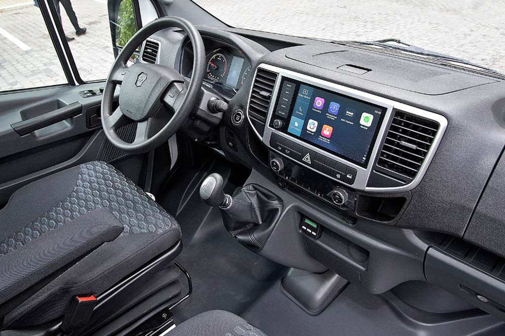 В штатное оснащение автомобиля входят: подрессоренное водительское кресло с регулировками по нескольким направлениям, кондиционер, мультимедийная система с тачскрином диагональю в 9 дюймов, 4 USB-порта, а также подогрев наружных зеркал, кресел и лобового стекла.