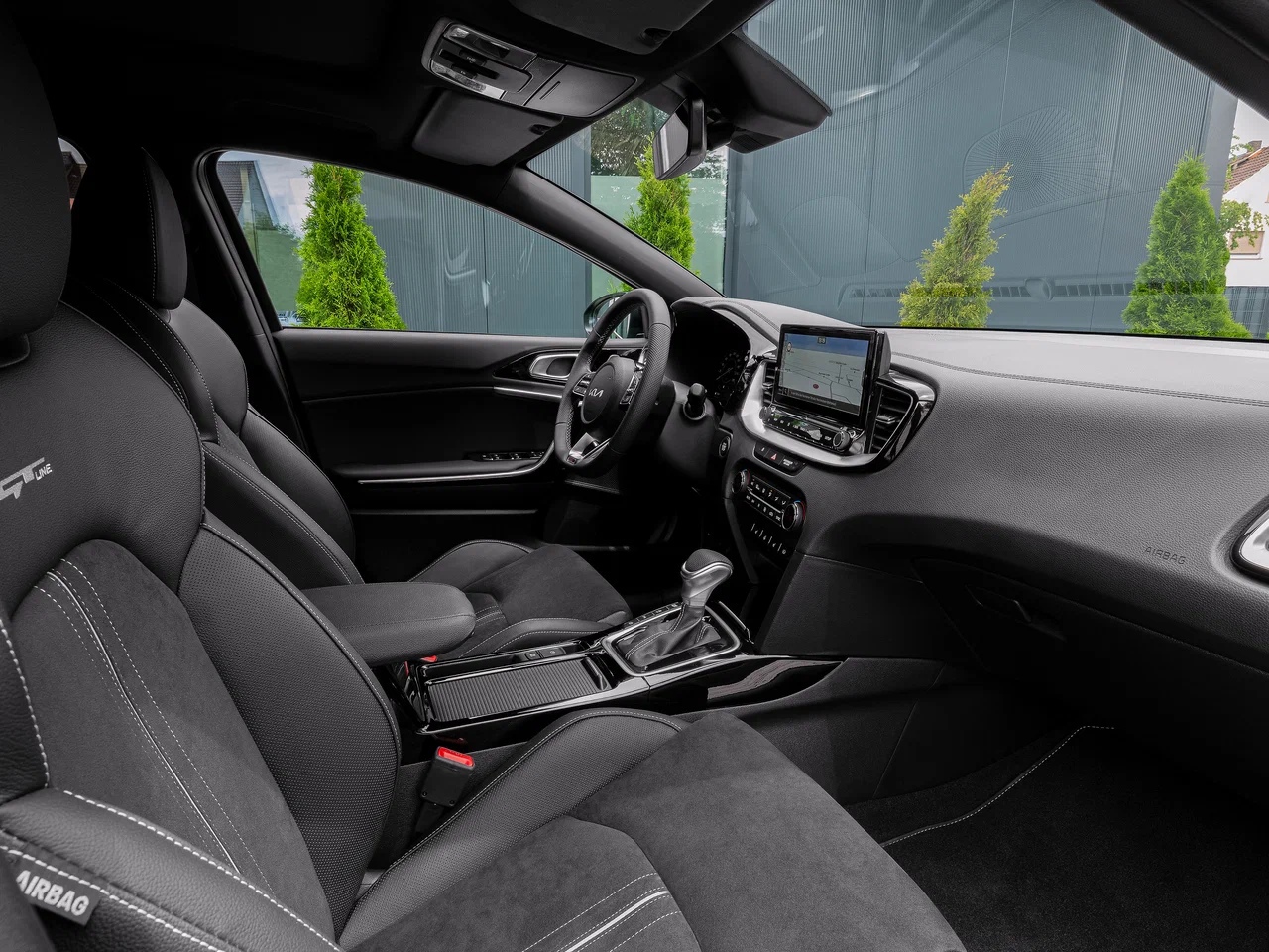 Список штатного оснащения KIA XСeed Luxe весьма обширен. В нём значатся: цифровая «приборка» с очень высоким уровнем информативности, 2-зонный климат-контроль, мультимедийная система с тачскрином диагональю в 8 дюймов, обогрев передних кресел, наружных зеркал и форсунок стеклоомывателей, а также багажные рейлинги на крыше.