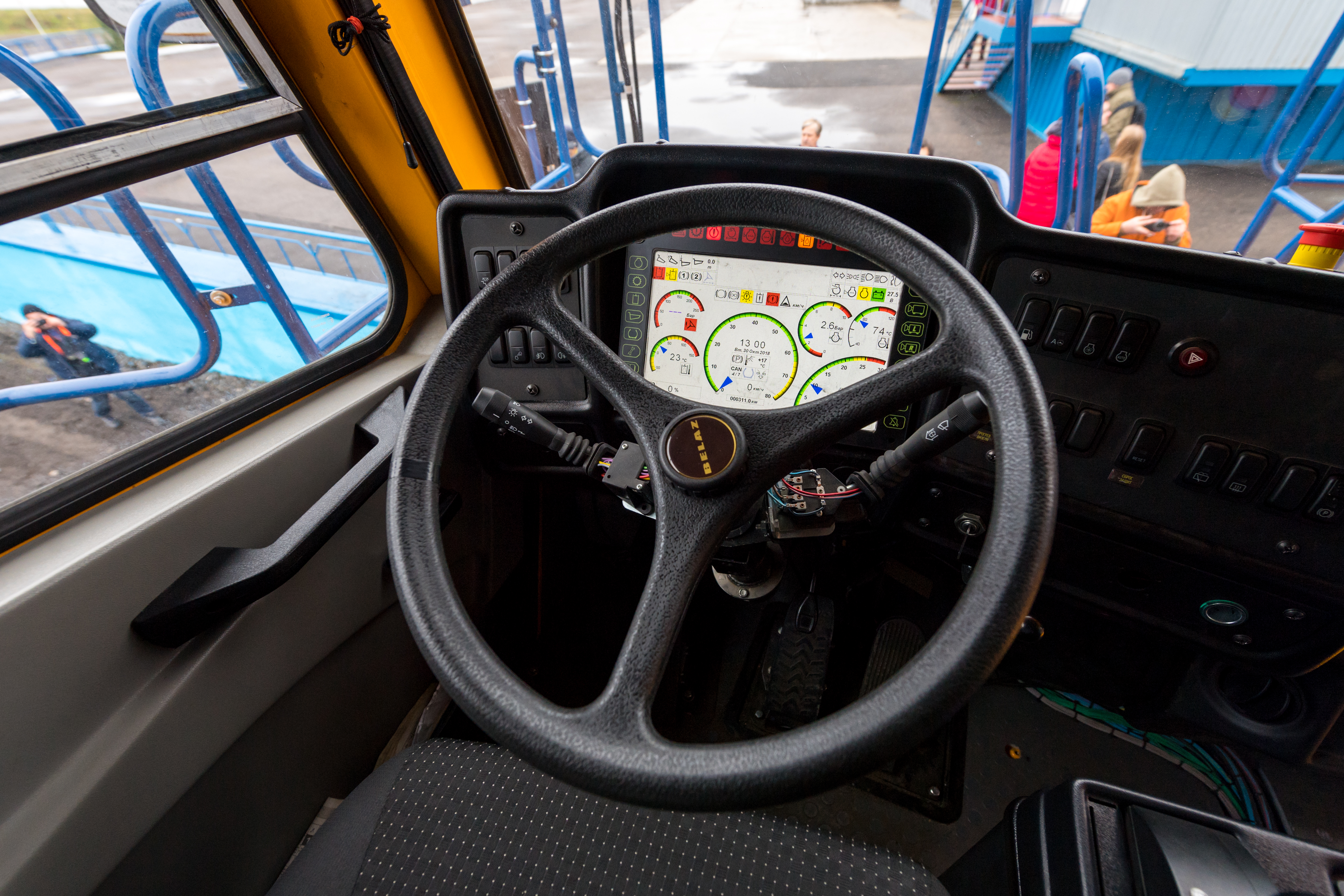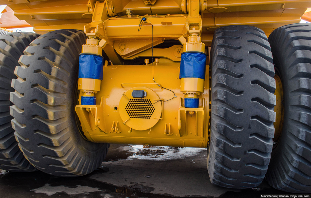 Следует отметить, что кабина нового самосвала соответствует стандартам безопасности ROPS и FOPS, а сверху её и палубу вокруг надёжно защищает удлинённый козырёк кузова. Успешно работать в условиях низких температур помогают дополнительный отопитель, двойное остекление и обогрев наружных зеркал.