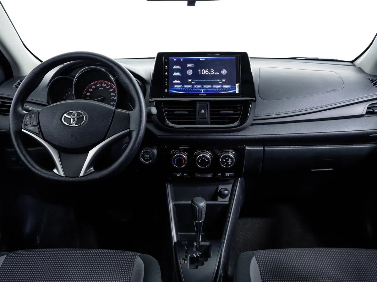Список штатного оснащения Toyota Vios не слишком обширен. В нём значатся: «противотуманки», многофункциональный руль с электроусиителем, фронтальные подушки безопасности для водителя и переднего пассажира, кондиционер, мультимедийная система с «парящим» тачскрином, а также некоторые другие опции комфорта и безопасности.
