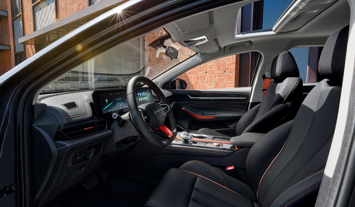 В салоне новинки имеются: «парящий» дисплей без солнцезащитного козырька, объединивший цифровую «приборку и тачскрин мультимедийной системы, передние кресла с развитой боковой поддержкой, обшивка с контрастной оранжевой прострочкой, а также декоративные элементы и ремни безопасности того же колера.