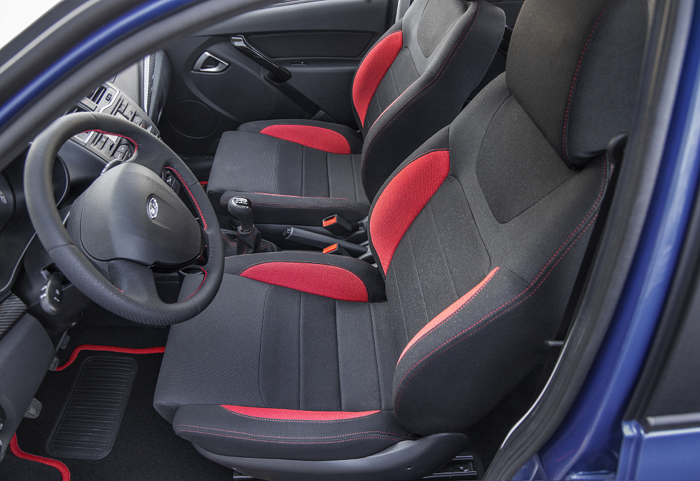 Оформление салона в исполнении Drive Active одинаково что у седана, что у лифтбека: анатомические передние кресла с развитой боковой поддержкой, контрастные вставки и прострочка красного цвета. Последней украшена кожаная обшивка руля и рычага КПП.