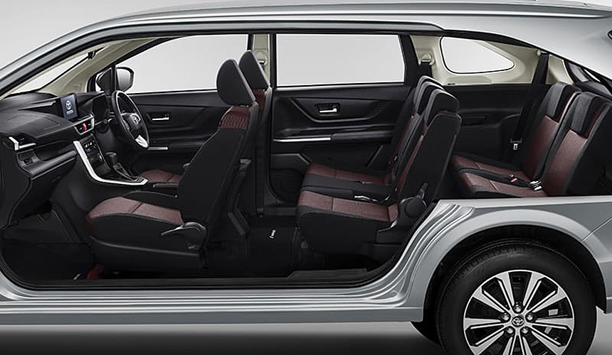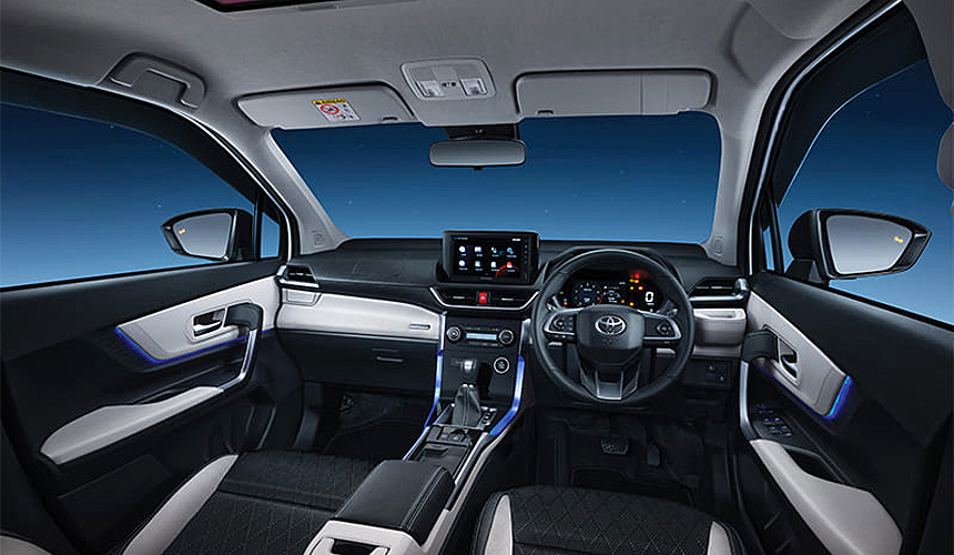 Хотя Toyota Veloz и дешёвая модель, перечень её штатного оснащения обширен. В него входят: виртуальная «приборка» диагональю в 7 дюймов, 3-зонный климат-контроль, электромеханический «ручник», мультимедийная система с тачскрином диагональю в 9 дюймов и отдельным экраном для задних пассажиров (он закреплён на потолке), а также много чего ещё.