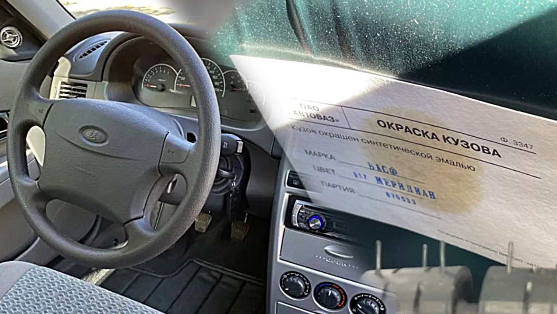 Как сообщает сам продавец, у «Приоры» — заводские детали, заводская резина и заводская покраска — кузов, кстати, цвета зелёный металлик, который на «АвтоВАЗе» в момент выпуска этой Lada Priora называли «Меридиан» — сохранилась даже бумажная табличка рядом с нишей запасного колеса, в которой об этом говорится.
