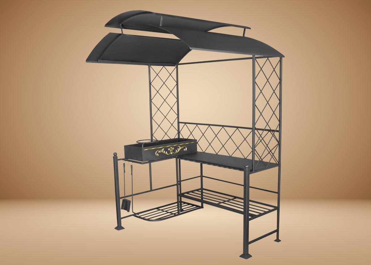 - С беседкой. Это самые крупные конструкции, которые включают в себя другие дополнительные опции. В них обычно есть лавочки и стол. Поэтому сразу после окончания готовки блюдо можно будет подать гостям и следить за второй партией, не отвлекаясь от еды.