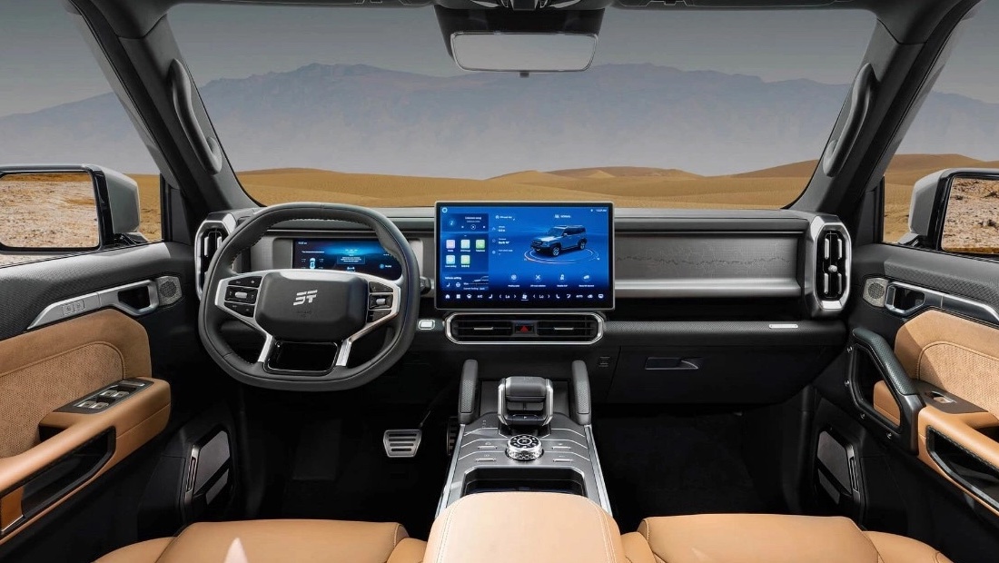 В интерьере Jetour T2 используются качественные и прочные материалы отделки, включая кожу и алькантару. На центральной консоли установлены два дисплея и консоль с шайбой выбора режимов движения. Предусмотрены многофункциональный руль, эргономичные сиденья, двухзонный климат-контроль и атмосферная светодиодная подсветка.