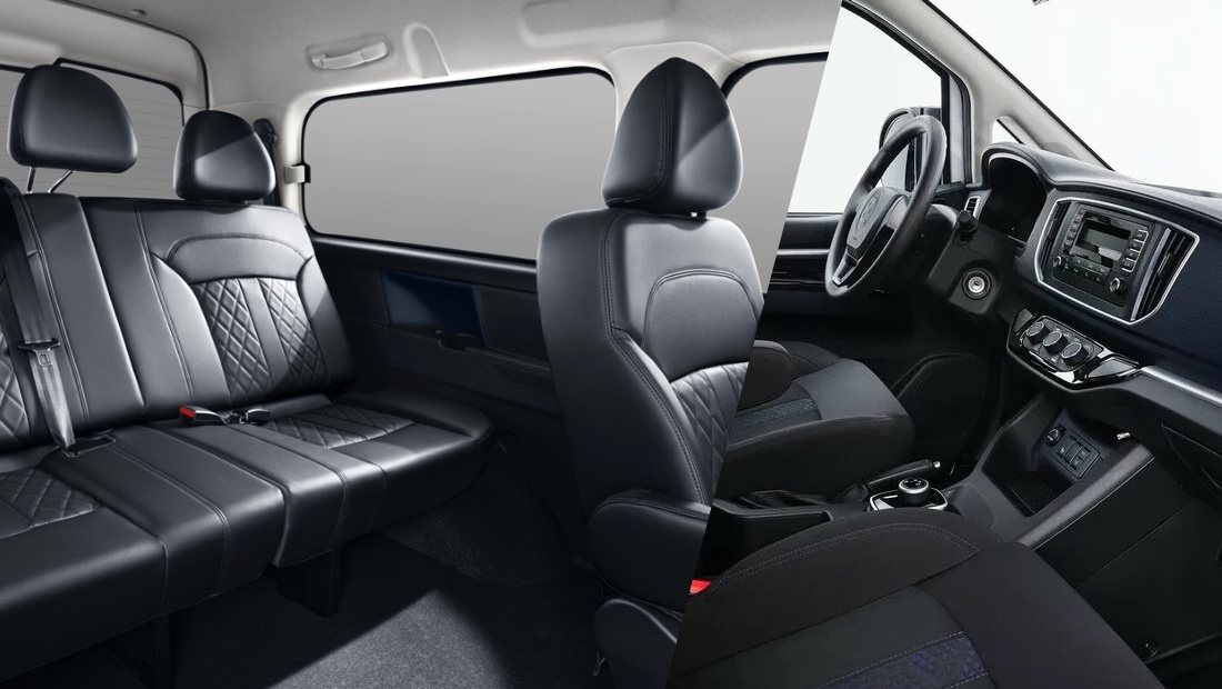 Интерьер с отделкой экокожей включает два отдельных капитанских кресла на втором ряду и трехместное сиденье на последнем ряду. Кресла третьего ряда могут быть сложены для облегчения загрузки и разгрузки или создания дополнительного пространства для багажа.