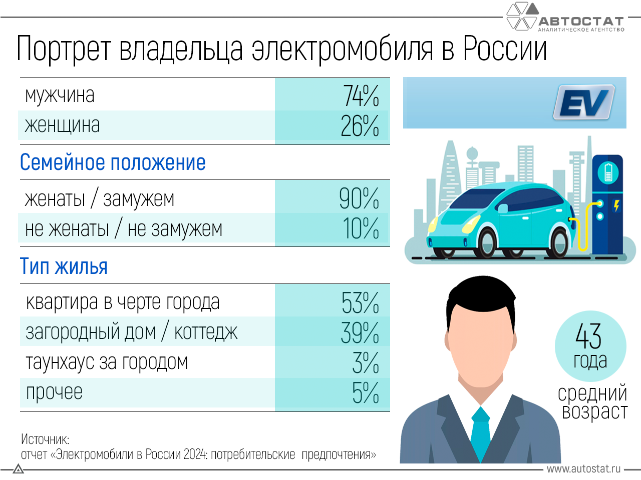 Получился усредненный портрет российского владельца электромобиля. Отметим, что общее число электромобилей в России в конце прошлого года составляло более 39 тысяч единиц, а продажи активно растут — в марте у нас был поставлен рекорд по продажам электромобилей.