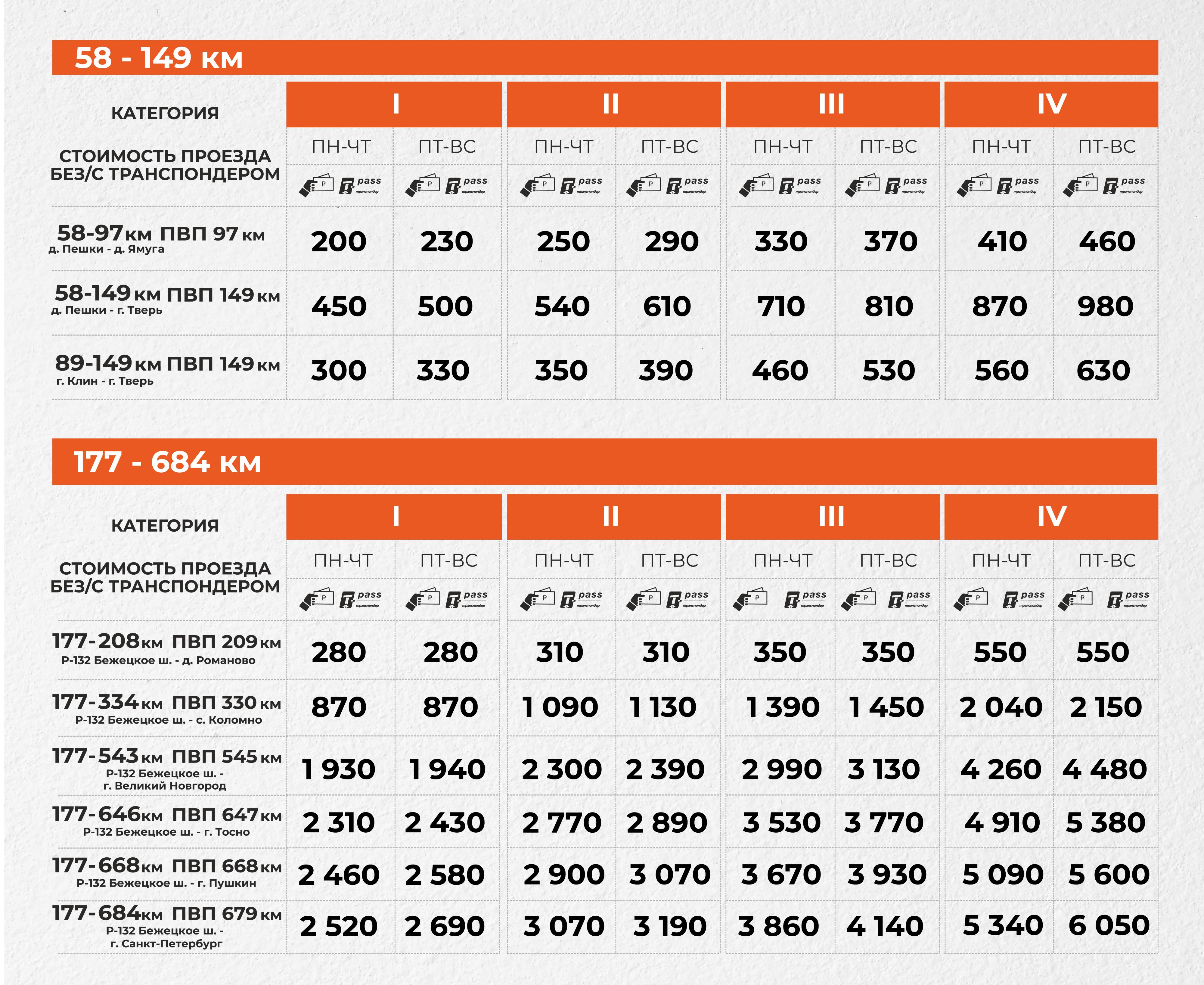Сейчас на сайте «Автодора», отвечающего за эксплуатацию трассы, можно увидеть ценник на проезд по участкам от 58 до 149 км и от 177 до 684 км.
