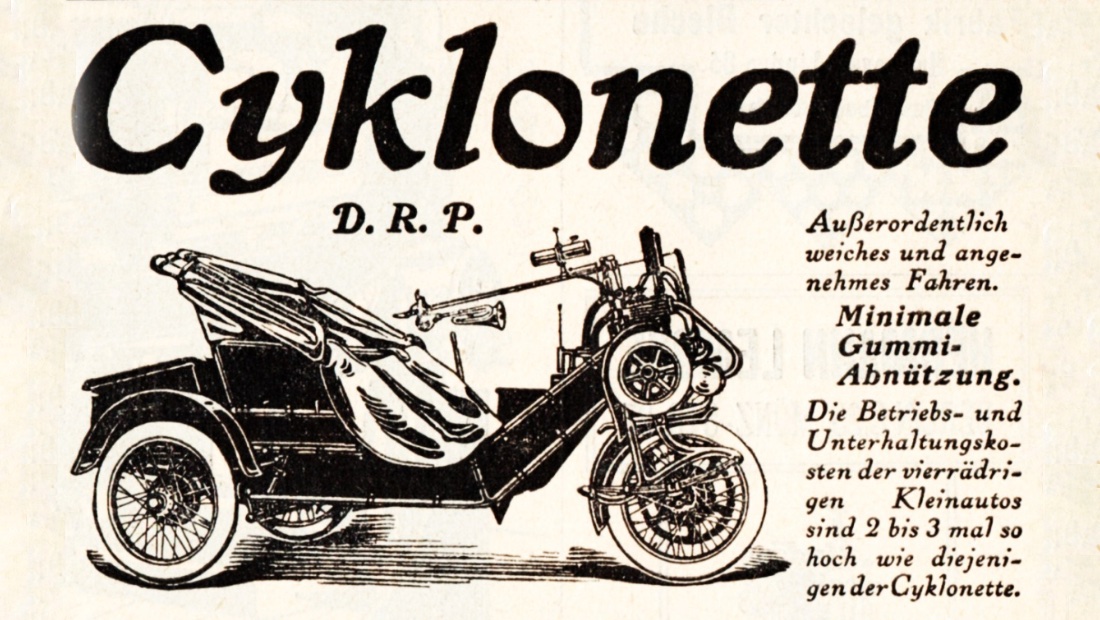 Одним из первых автомобилей с передним приводом являлась позабытая «Циклонетта» — Cyklon Cyklonette был выпущен в 1902 году немецкой фабрикой «Циклон», которая открывалась для выпуска мотоциклов «Вернер» по лицензии.