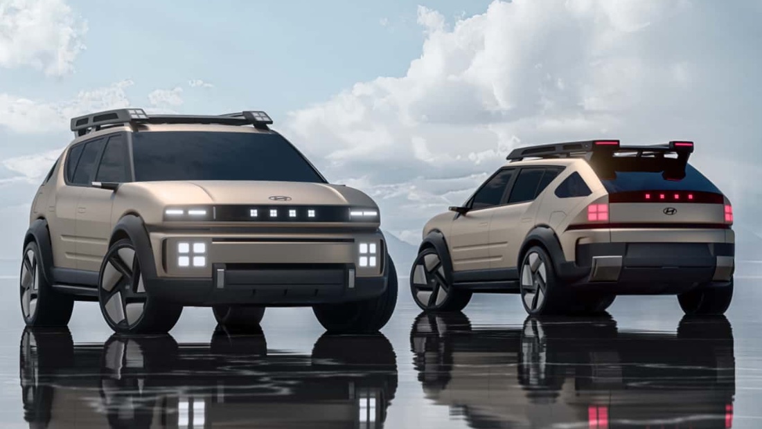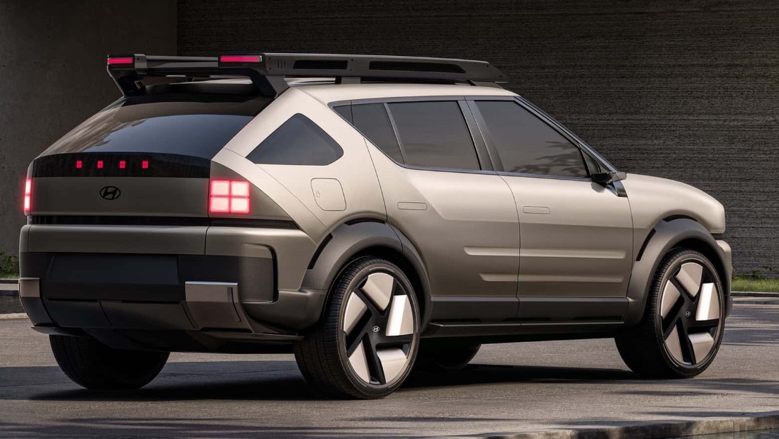 Сам Hyundai Initium — это массивный внедорожник на 21-дюймовых колёсах с выпуклыми крыльями с чёрной пластиковой отделкой. На его крыше разметили багажник с фонарями, также выполненными в стилистике HTWO (тот самый кубик). Эта концепция повторяется и в задних фонарях, и в стоп-сигнале.
