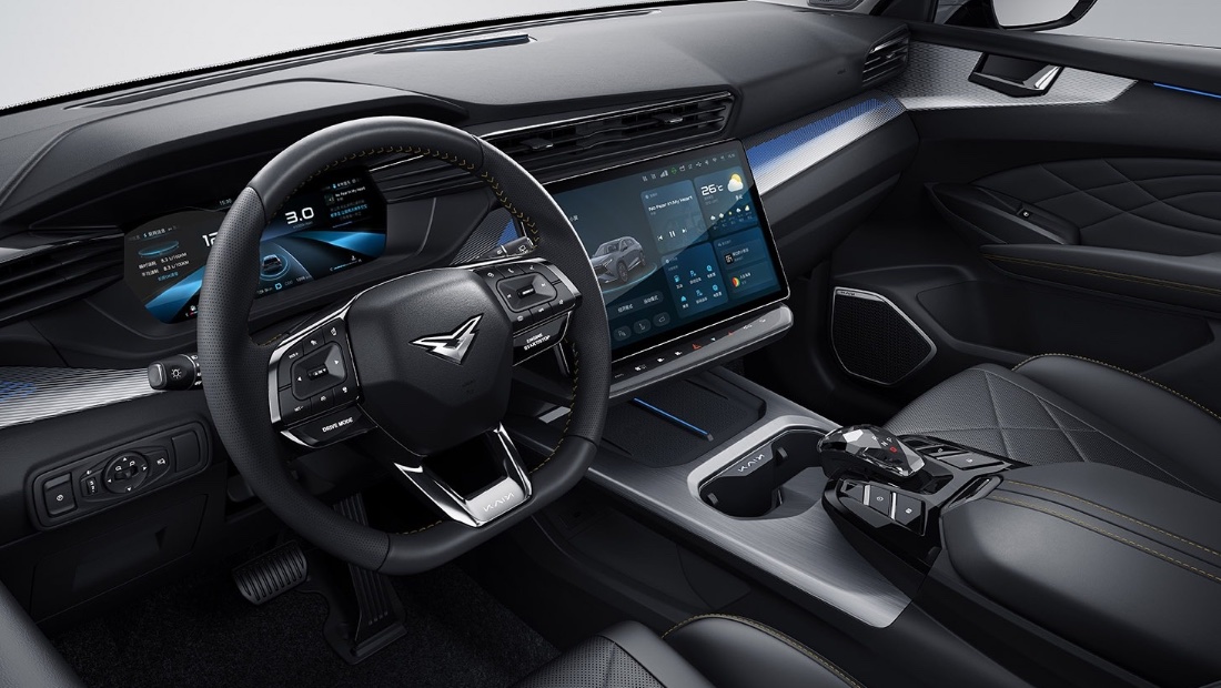 Салон выполнен в спортивном стиле, но в общем вполне стандартный — как ив плане дизайна экстерьера, так и оснащения. Доступны система камер кругового обзора, несколько систем помощи при вождении, а также голосовой помощник