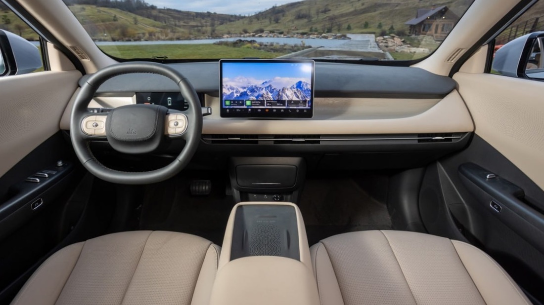 Салон доступен в темно‑сером или бежевом варианте. На центральной панели установлен 12,8‑дюймовый экран мультимедиа с поддержкой Apple CarPlay. Есть беспроводная зарядка для смартфона на 50 Вт, два порта Type‑C и два разъема 12 В.