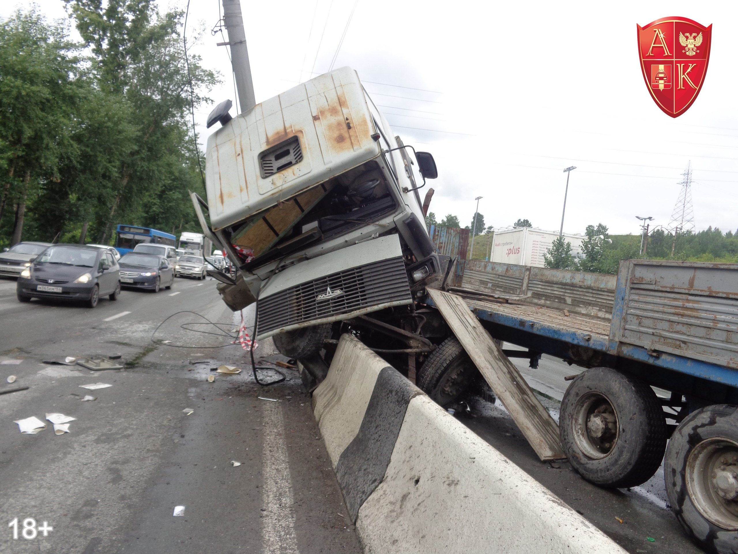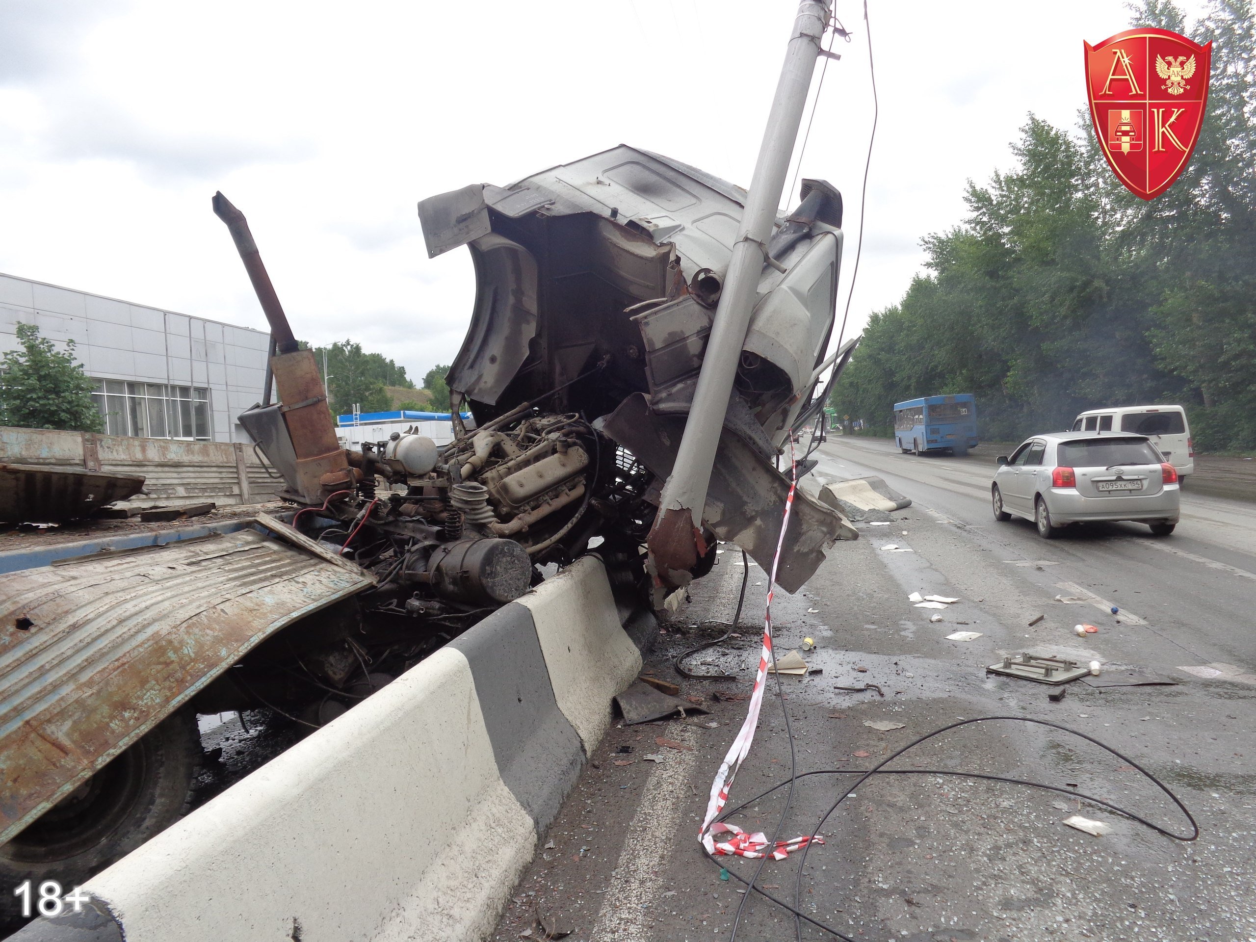 ДТП случилось 17 июля в Новосибирске на улице Большевистская. Водитель МАЗа не справился с управлением и тяжелая машина наехала на разделительный барьер и на столб. По счастью водитель не пострадал.