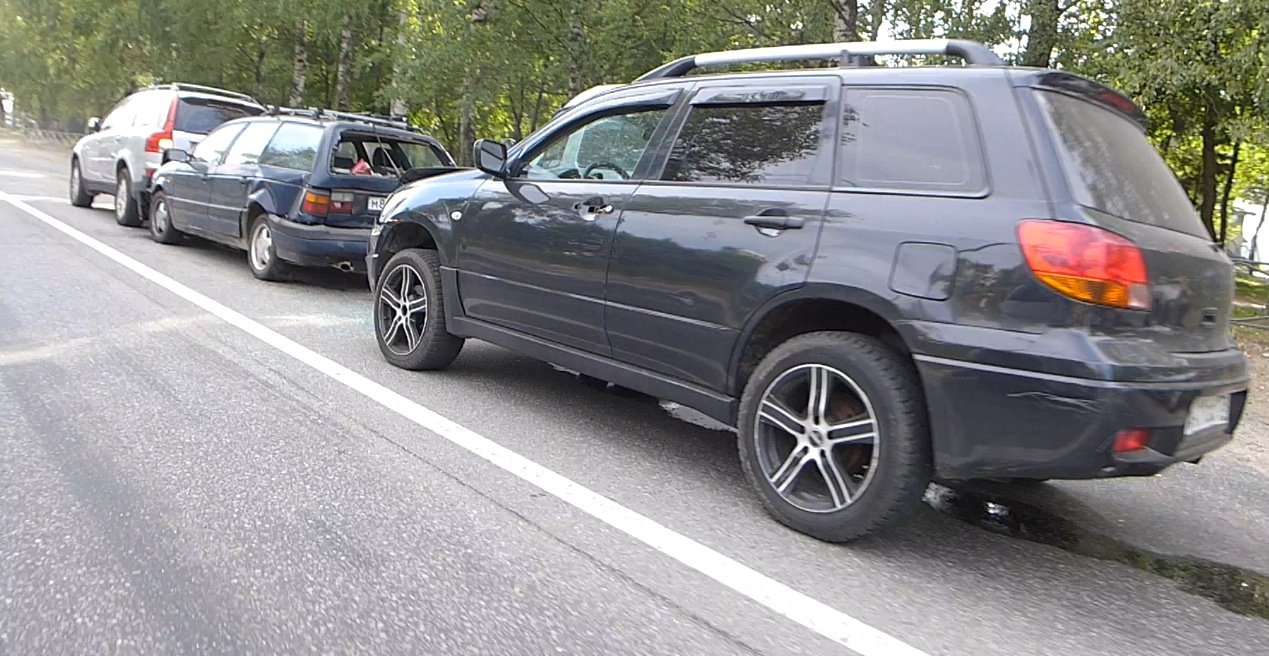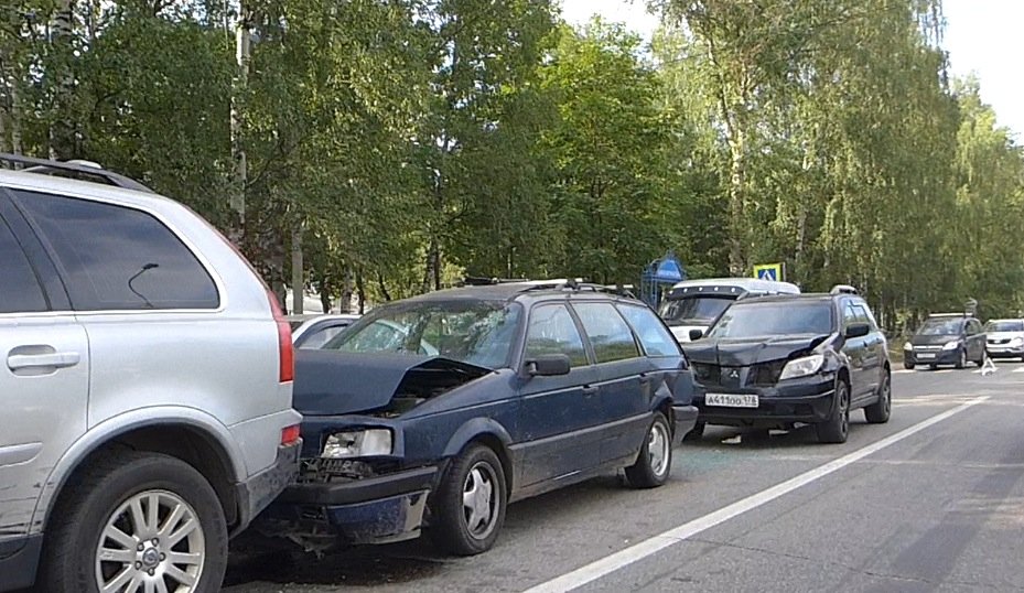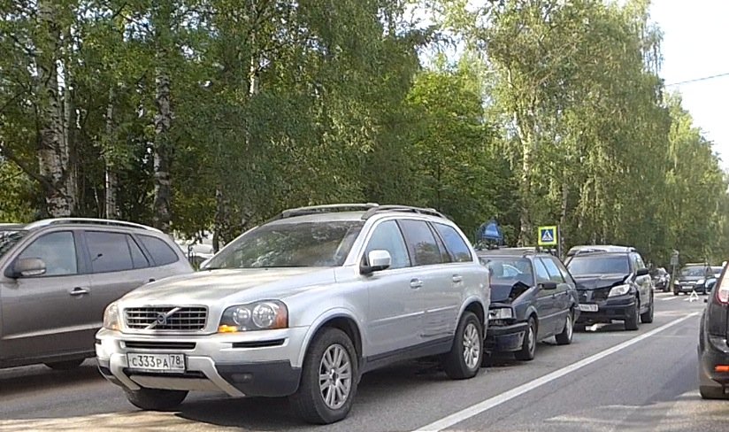 Досадный "паровозик" случился в городе Кировск напротив парка развлечений. Судя по всему по непоянтной причине водитель кроссовера Volvo XC резко затормозил, в то время как ехавшие за ним водители автомобилей Volkswagen PAssat и Mitsubishi Outlander среагировать не успели и довольно сильно врезались друг в друга.