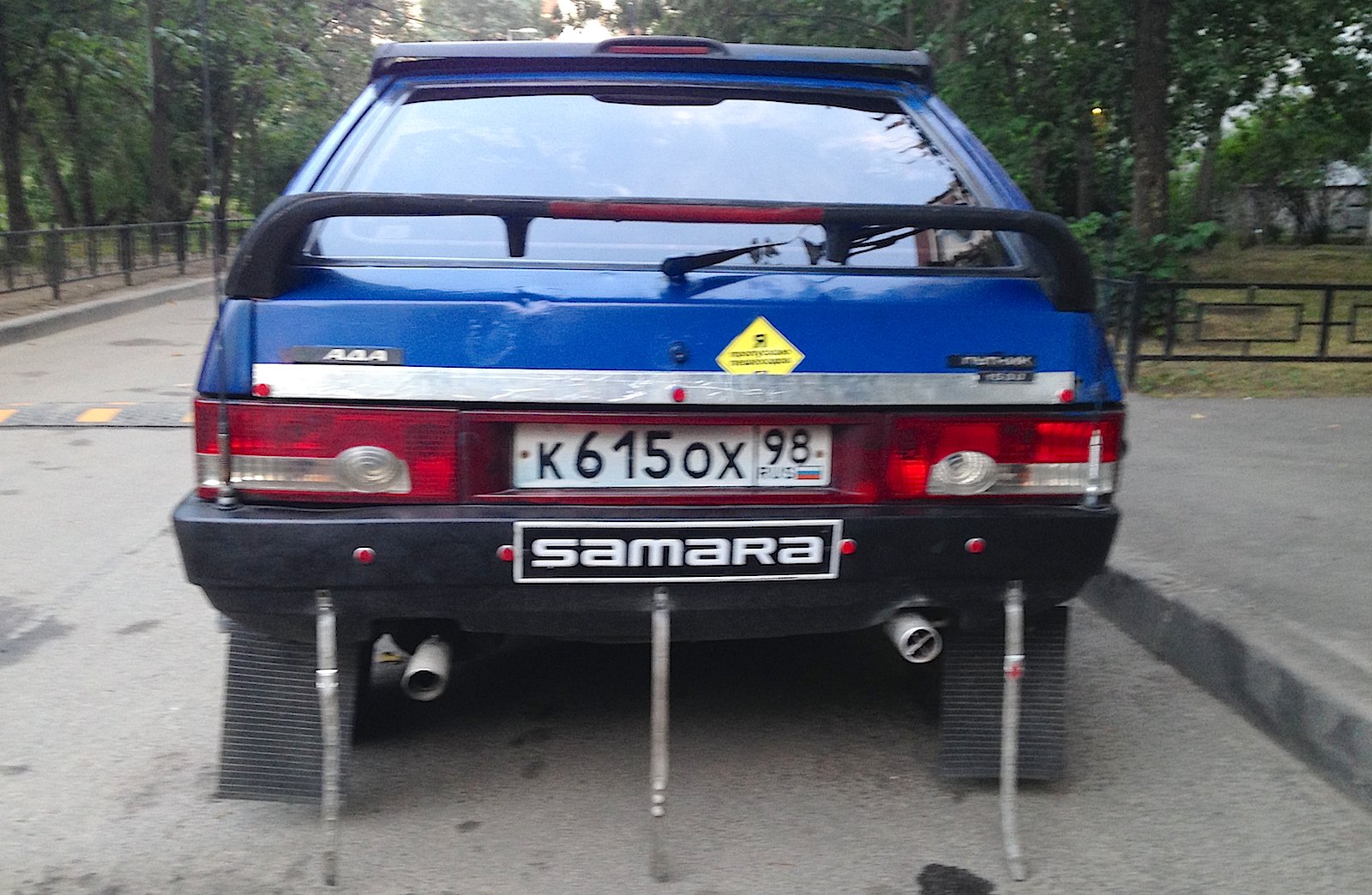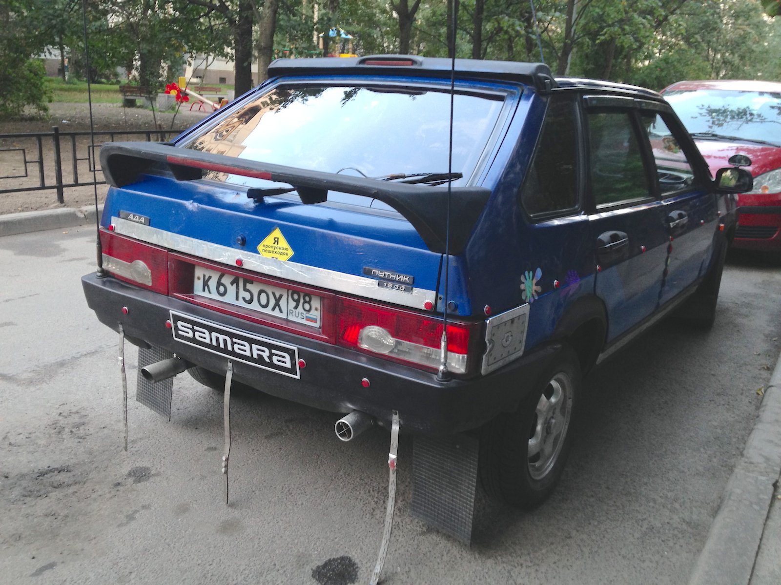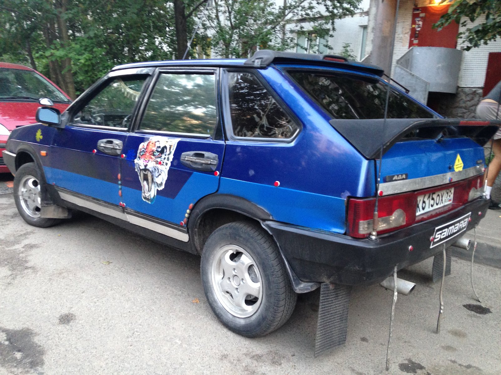Двойной выхлоп двигателя, пыле-мухоотбойник на капоте, эксклюзивная решетка радиатора, две радиоантенны на заднем бампере, двух-цветный окрас (голубой на синий), хромировано-жестяные включения в дизайн, гигантские брызговики, наклейки на бортах, крышка топливного бака "под металл!", противотуманки, литые диски, дополнительные зеркала заднего вида, многочисленные катафоты и много всего прочего. Автор работы неизвестен. Снято в Выборгском районе Санкт-Петербурга