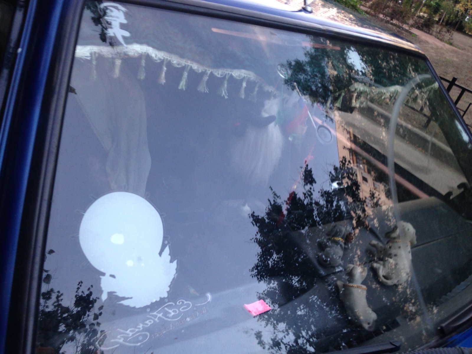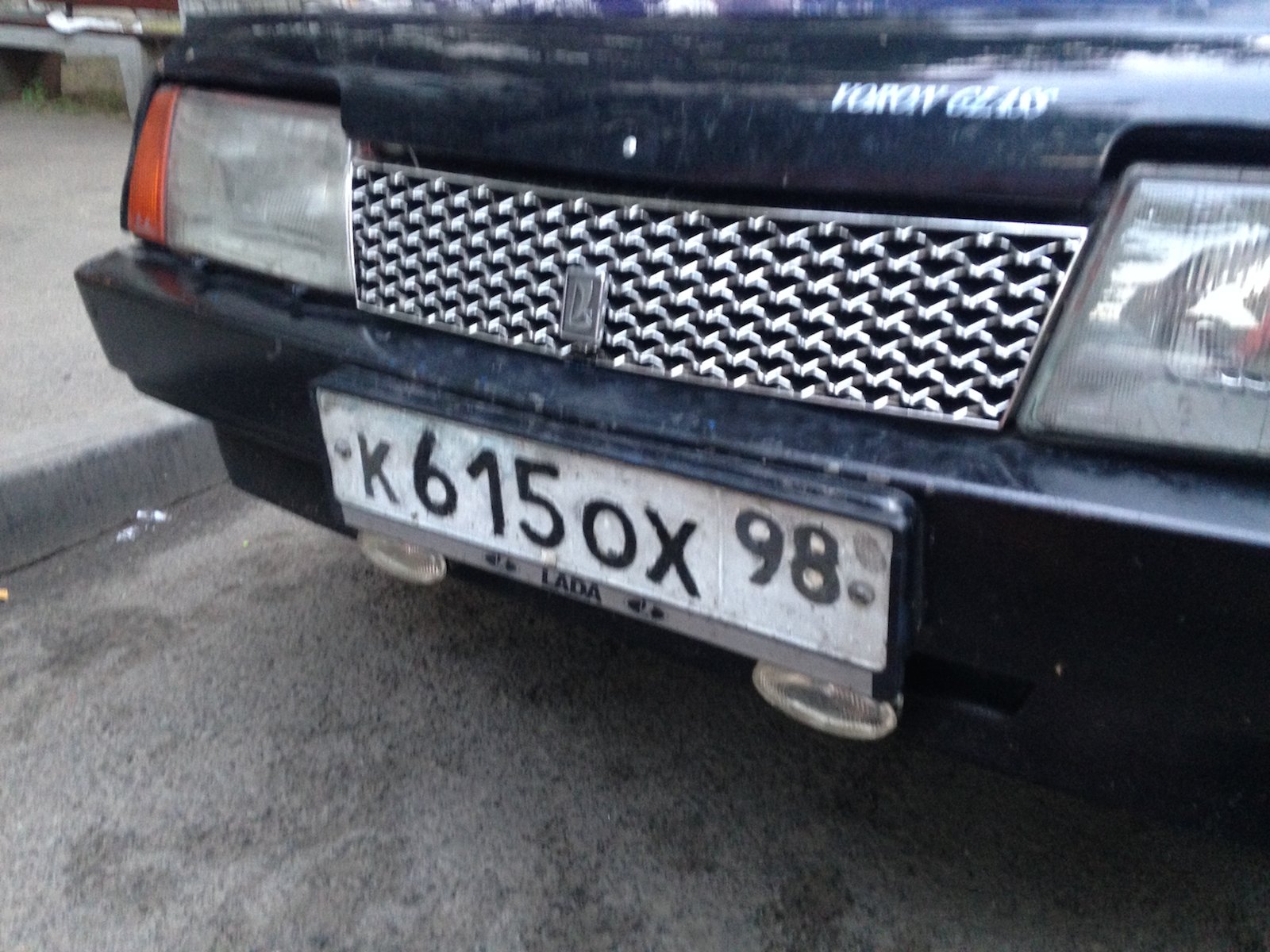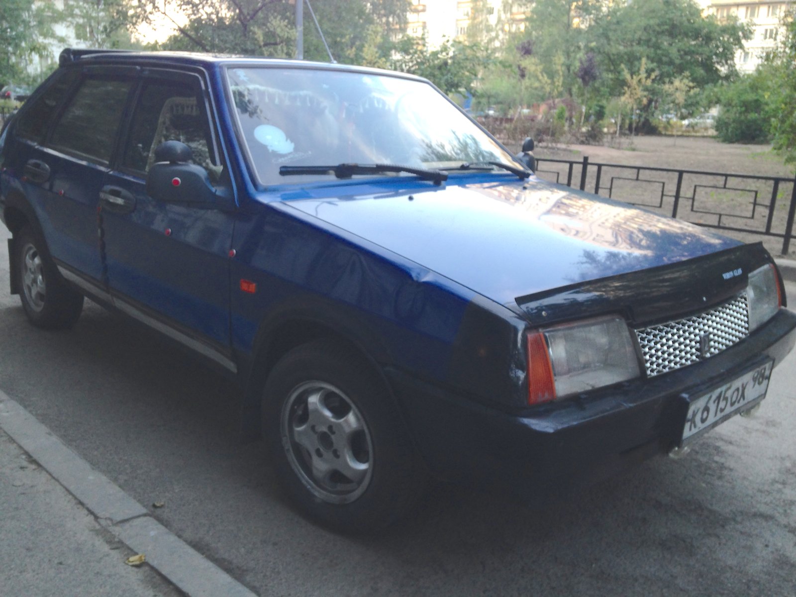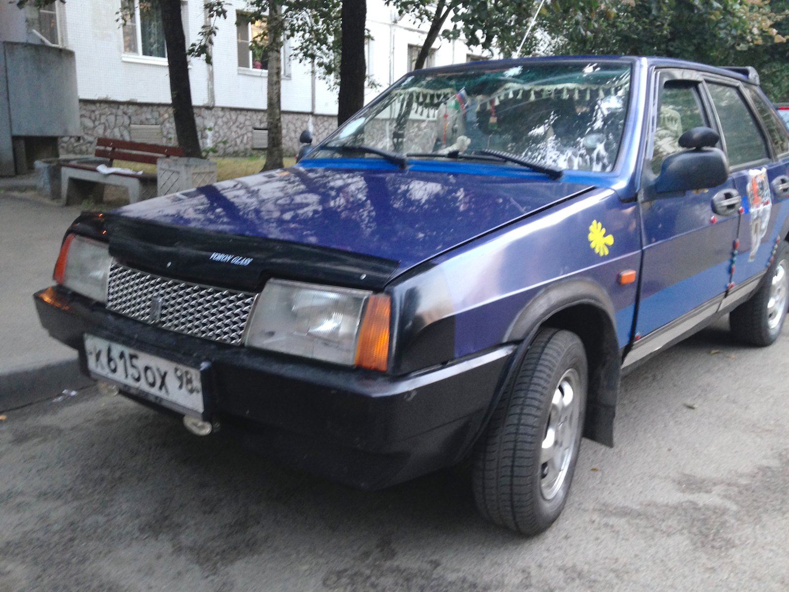Двойной выхлоп двигателя, пыле-мухоотбойник на капоте, эксклюзивная решетка радиатора, две радиоантенны на заднем бампере, двух-цветный окрас (голубой на синий), хромировано-жестяные включения в дизайн, гигантские брызговики, наклейки на бортах, крышка топливного бака "под металл!", противотуманки, литые диски, дополнительные зеркала заднего вида, многочисленные катафоты и много всего прочего. Автор работы неизвестен. Снято в Выборгском районе Санкт-Петербурга